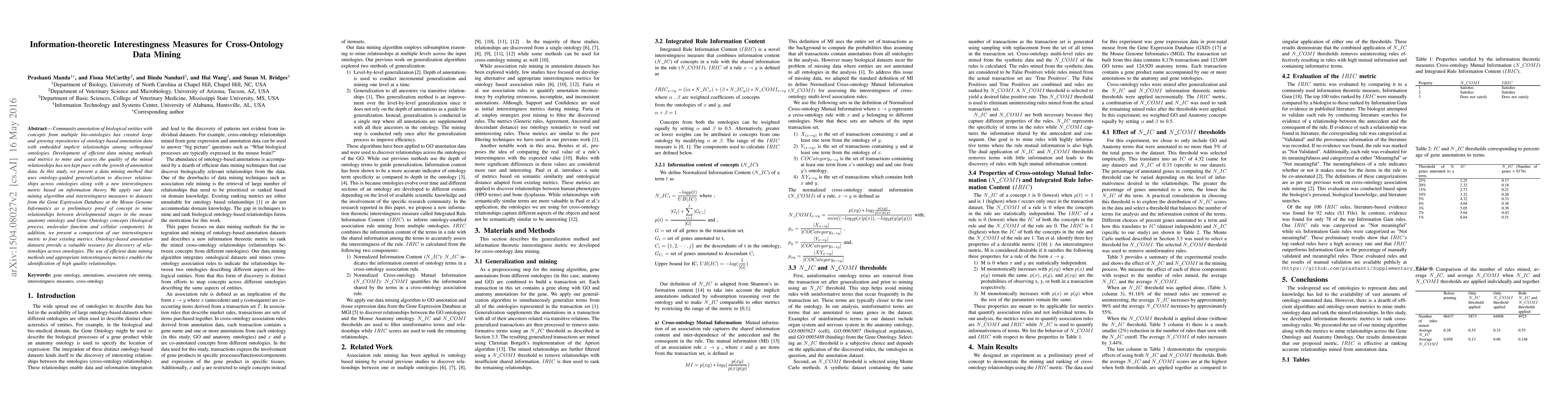 This paper introduces a data mining method using ontology-guided generalization to uncover relationships across different bio-ontologies, accompanied by a new information-theoretic interestingness metric. The method is demonstrated on Gene Expression Database datasets to identify relationships between mouse anatomy and Gene Ontology concepts, and is compared against four existing metrics.