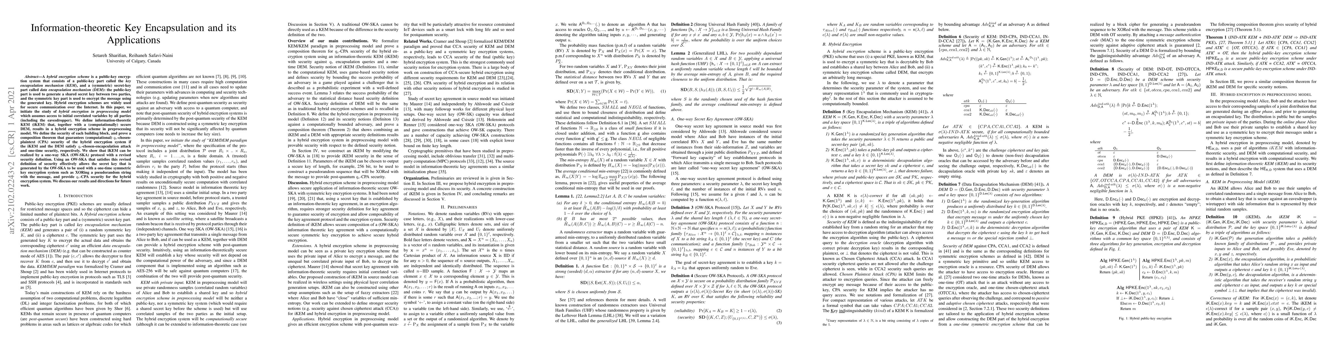 This paper explores hybrid encryption schemes in a preprocessing model where all parties, including eavesdroppers, have access to initial correlated variables. It introduces an information-theoretic key encapsulation mechanism (iKEM) that, combined with a computationally secure data encapsulation mechanism (DEM), ensures secure communication. The paper proves a composition theorem for the security of the hybrid encryption system under certain conditions.