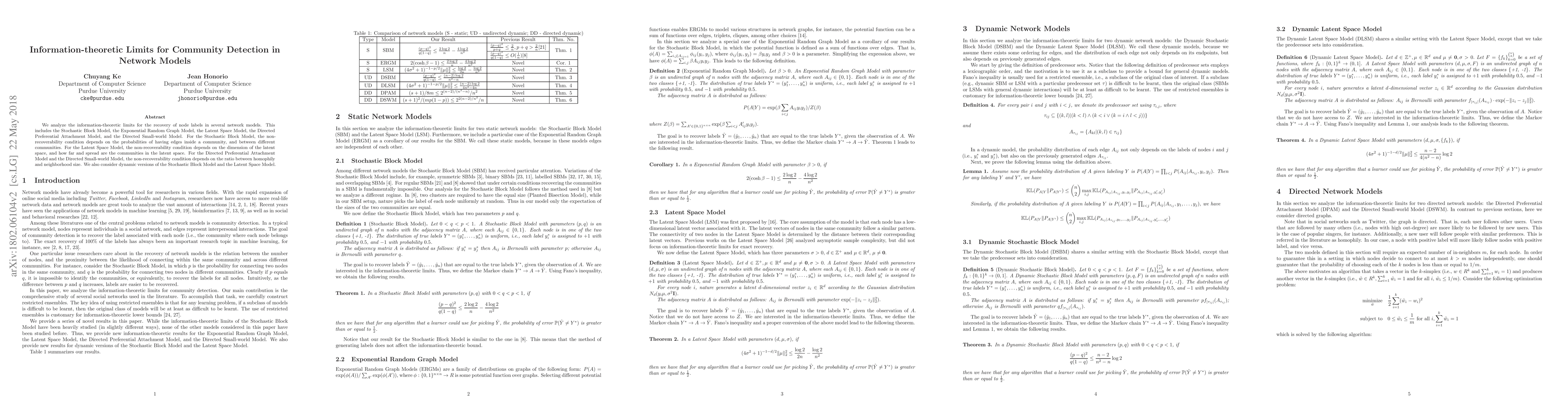 We analyze the information-theoretic limits for the recovery of node labels in several network models. This includes the Stochastic Block Model, the Exponential Random Graph Model, the Latent Space Model, the Directed Preferential Attachment Model, and the Directed Small-world Model. For the Stochastic Block Model, the non-recoverability condition depends on the probabilities of having edges inside a community, and between different communities. For the Latent Space Model, the non-recoverability condition depends on the dimension of the latent space, and how far and spread are the communities in the latent space. For the Directed Preferential Attachment Model and the Directed Small-world Model, the non-recoverability condition depends on the ratio between homophily and neighborhood size. We also consider dynamic versions of the Stochastic Block Model and the Latent Space Model.