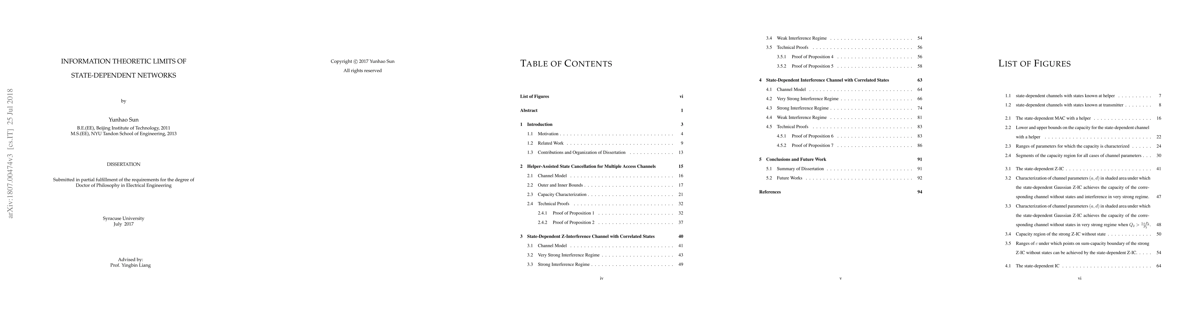 We investigate the information theoretic limits of two types of state-dependent models in this dissertation. These models capture a wide range of wireless communication scenarios where there are interference cognition among transmitters. Hence, information theoretic studies of these models provide useful guidelines for designing new interference cancellation schemes in practical wireless networks. In particular, we first study the two-user state-dependent Gaussian multiple access channel (MAC) with a helper. Inner and outer bounds on the capacity region are first derived, which improve the state-of-the-art bounds given in the literature. Further comparison of these bounds yields either segments on the capacity region boundary or the full capacity region by considering various regimes of channel parameters. We then study the two-user Gaussian state-dependent Z-IC and state-dependent IC. Three interference regimes are studied, and the capacity region or the sum capacity boundary is characterized either fully or partially under various channel parameters. The impact of the correlation between the states on the cancellation of state and interference as well as the achievability of the capacity is demonstrated via numerical analysis. Numerical investigation indicates that for the regular IC, the correlation between states impacts the achievability of the channel capacity in a different way from that of the Z-IC.