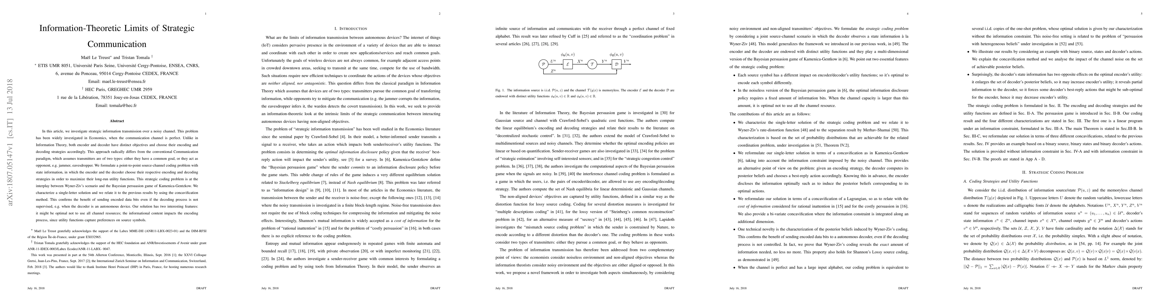 In this article, we investigate strategic information transmission over a noisy channel. This problem has been widely investigated in Economics, when the communication channel is perfect. Unlike in Information Theory, both encoder and decoder have distinct objectives and choose their encoding and decoding strategies accordingly. This approach radically differs from the conventional Communication paradigm, which assumes transmitters are of two types: either they have a common goal, or they act as opponent, e.g. jammer, eavesdropper. We formulate a point-to-point source-channel coding problem with state information, in which the encoder and the decoder choose their respective encoding and decoding strategies in order to maximize their long-run utility functions. This strategic coding problem is at the interplay between Wyner-Ziv's scenario and the Bayesian persuasion game of Kamenica-Gentzkow. We characterize a single-letter solution and we relate it to the previous results by using the concavification method. This confirms the benefit of sending encoded data bits even if the decoding process is not supervised, e.g. when the decoder is an autonomous device. Our solution has two interesting features: it might be optimal not to use all channel resources; the informational content impacts the encoding process, since utility functions capture preferences on source symbols.