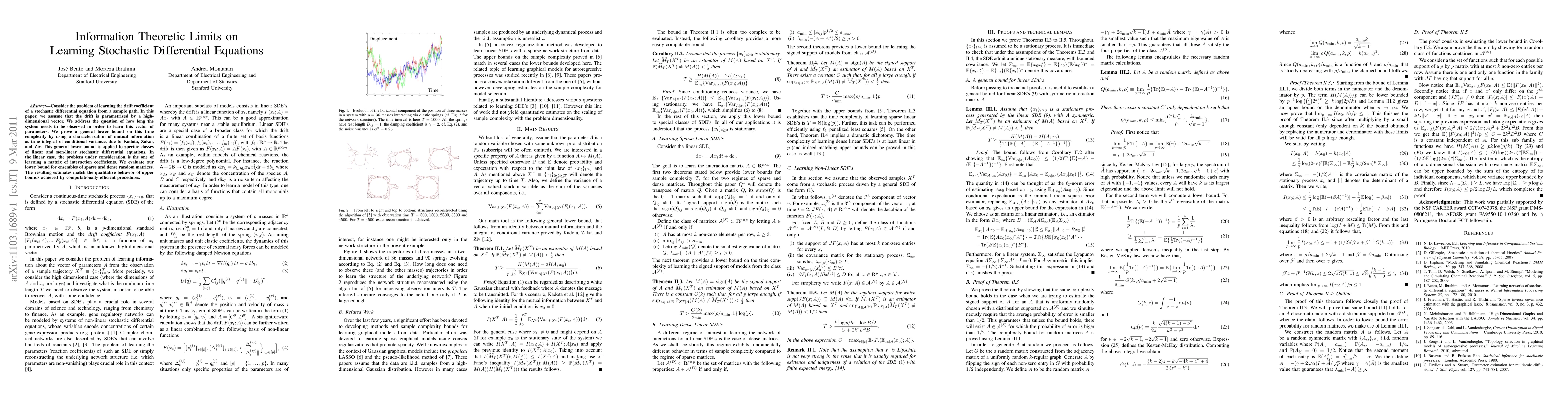 Consider the problem of learning the drift coefficient of a stochastic differential equation from a sample path. In this paper, we assume that the drift is parametrized by a high dimensional vector. We address the question of how long the system needs to be observed in order to learn this vector of parameters. We prove a general lower bound on this time complexity by using a characterization of mutual information as time integral of conditional variance, due to Kadota, Zakai, and Ziv. This general lower bound is applied to specific classes of linear and non-linear stochastic differential equations. In the linear case, the problem under consideration is the one of learning a matrix of interaction coefficients. We evaluate our lower bound for ensembles of sparse and dense random matrices. The resulting estimates match the qualitative behavior of upper bounds achieved by computationally efficient procedures.