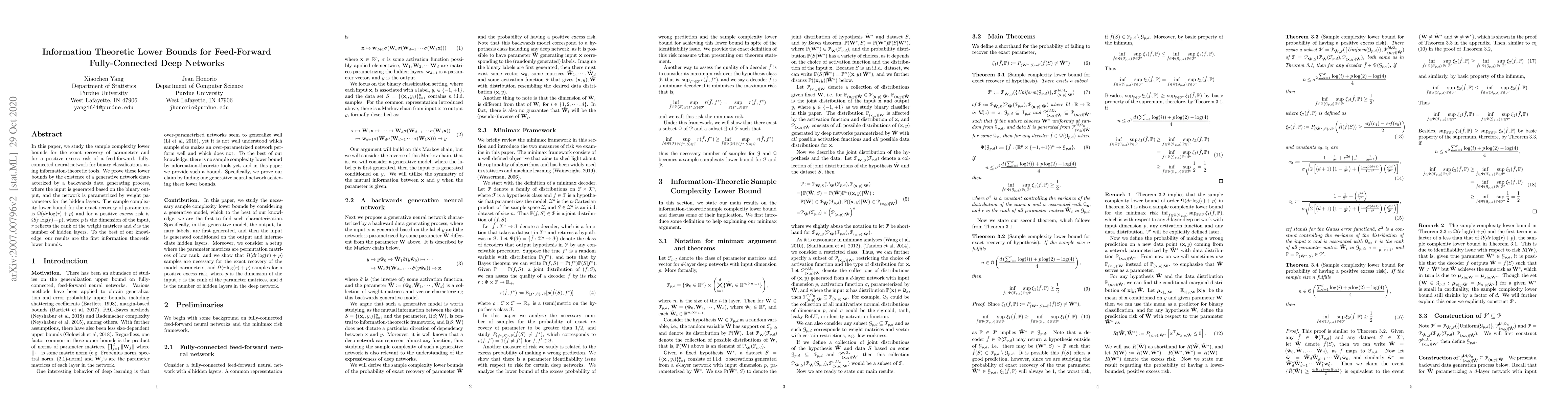 In this paper, we study the sample complexity lower bounds for the exact recovery of parameters and for a positive excess risk of a feed-forward, fully-connected neural network for binary classification, using information-theoretic tools. We prove these lower bounds by the existence of a generative network characterized by a backwards data generating process, where the input is generated based on the binary output, and the network is parametrized by weight parameters for the hidden layers. The sample complexity lower bound for the exact recovery of parameters is $\Omega(d r \log(r) + p )$ and for a positive excess risk is $\Omega(r \log(r) + p )$, where $p$ is the dimension of the input, $r$ reflects the rank of the weight matrices and $d$ is the number of hidden layers. To the best of our knowledge, our results are the first information theoretic lower bounds.