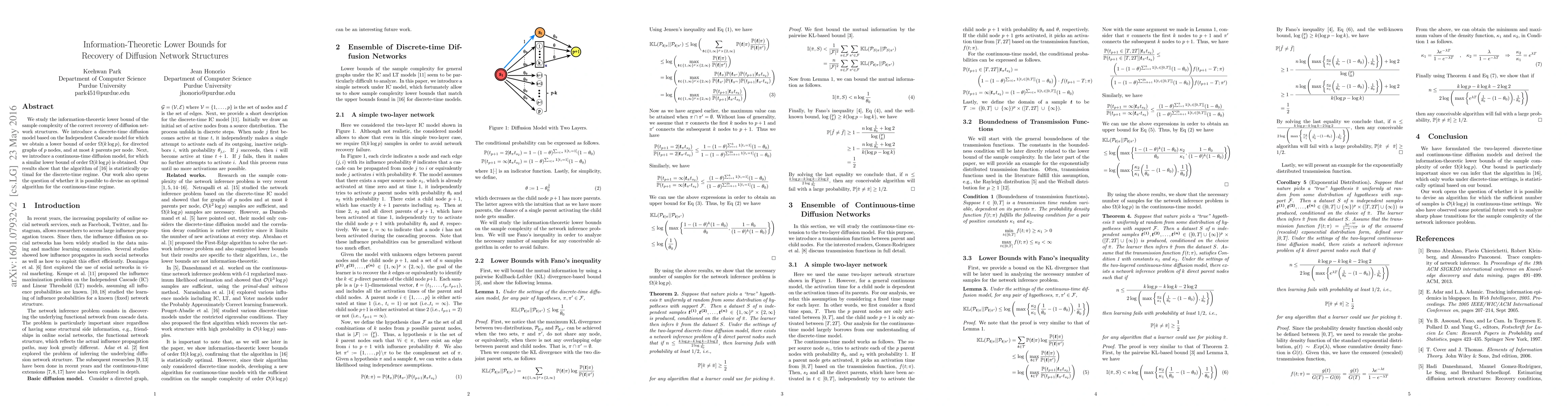 This research paper establishes a lower bound of $oxed{ ext{ extOmega}(k ext{ extlog} p)}$ for the recovery of diffusion network structures using information theory, suggesting that current algorithms may not be statistically optimal.