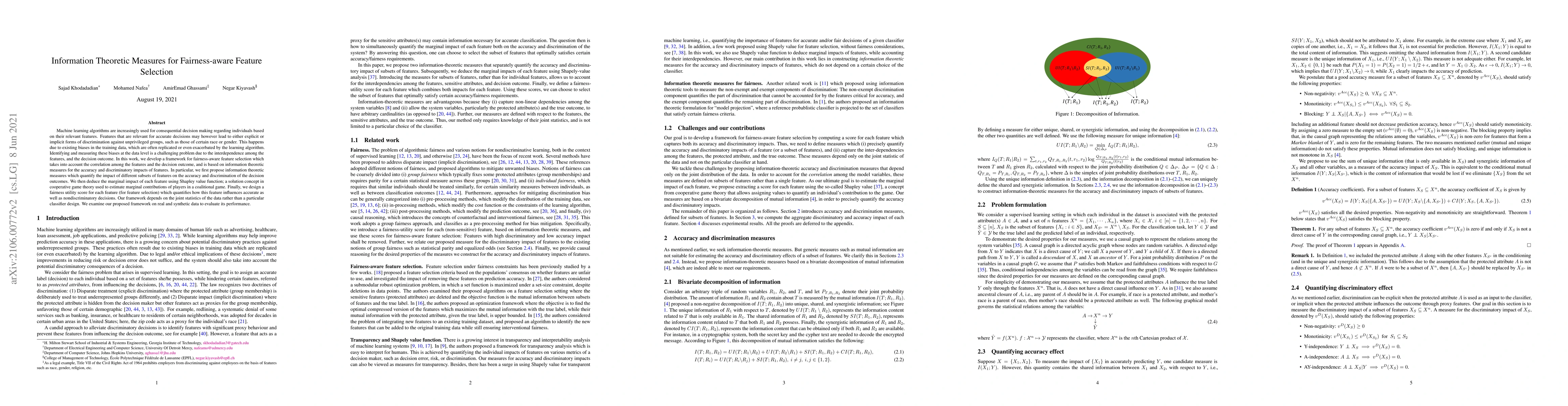 This paper proposes a framework for fairness-aware feature selection using information theoretic measures to quantify the accuracy and discriminatory impact of features. It introduces a fairness utility score for each feature based on the Shapley value function, aiming to balance accurate and nondiscriminatory decisions.