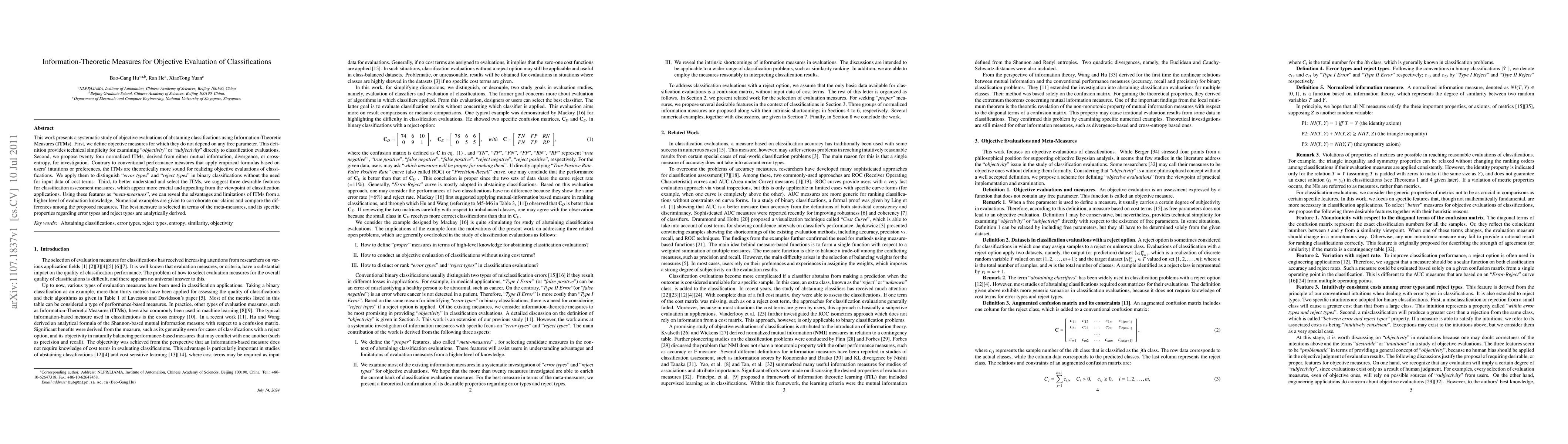 This work presents a systematic study of objective evaluations of abstaining classifications using Information-Theoretic Measures (ITMs). First, we define objective measures for which they do not depend on any free parameter. This definition provides technical simplicity for examining "objectivity" or "subjectivity" directly to classification evaluations. Second, we propose twenty four normalized ITMs, derived from either mutual information, divergence, or cross-entropy, for investigation. Contrary to conventional performance measures that apply empirical formulas based on users' intuitions or preferences, the ITMs are theoretically more sound for realizing objective evaluations of classifications. We apply them to distinguish "error types" and "reject types" in binary classifications without the need for input data of cost terms. Third, to better understand and select the ITMs, we suggest three desirable features for classification assessment measures, which appear more crucial and appealing from the viewpoint of classification applications. Using these features as "meta-measures", we can reveal the advantages and limitations of ITMs from a higher level of evaluation knowledge. Numerical examples are given to corroborate our claims and compare the differences among the proposed measures. The best measure is selected in terms of the meta-measures, and its specific properties regarding error types and reject types are analytically derived.
