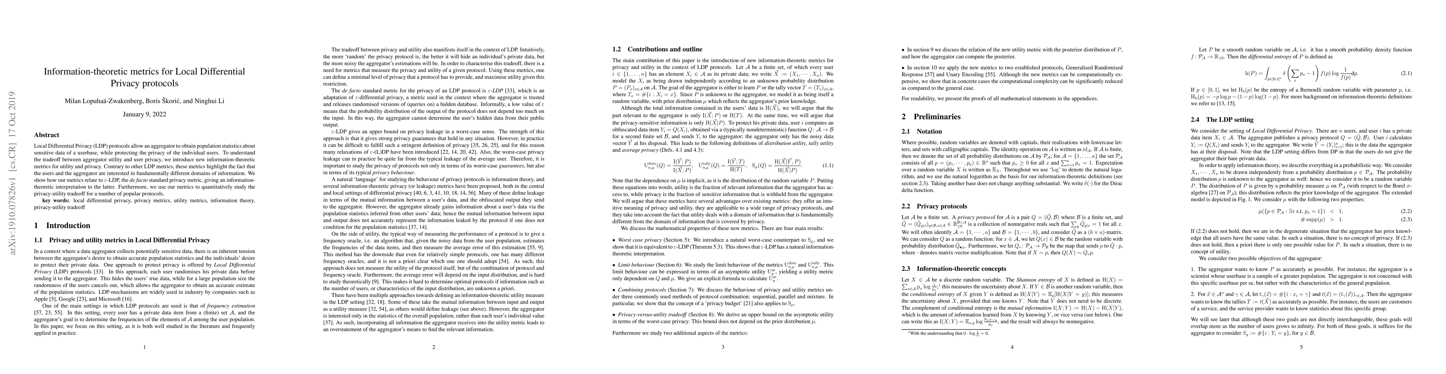 Local Differential Privacy (LDP) protocols allow an aggregator to obtain population statistics about sensitive data of a userbase, while protecting the privacy of the individual users. To understand the tradeoff between aggregator utility and user privacy, we introduce new information-theoretic metrics for utility and privacy. Contrary to other LDP metrics, these metrics highlight the fact that the users and the aggregator are interested in fundamentally different domains of information. We show how our metrics relate to $\varepsilon$-LDP, the \emph{de facto} standard privacy metric, giving an information-theoretic interpretation to the latter. Furthermore, we use our metrics to quantitatively study the privacy-utility tradeoff for a number of popular protocols.
