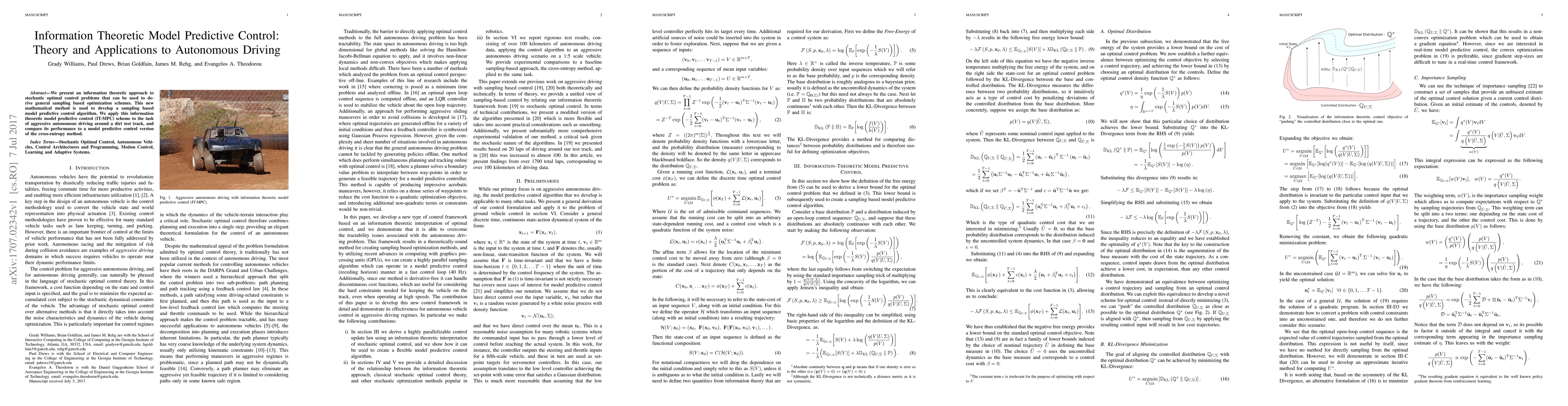 This paper introduces an information theoretic approach to stochastic optimal control, developing a new sampling-based model predictive control algorithm. The proposed method is applied to aggressive autonomous driving, demonstrating its effectiveness compared to a model predictive control version of the cross-entropy method.
