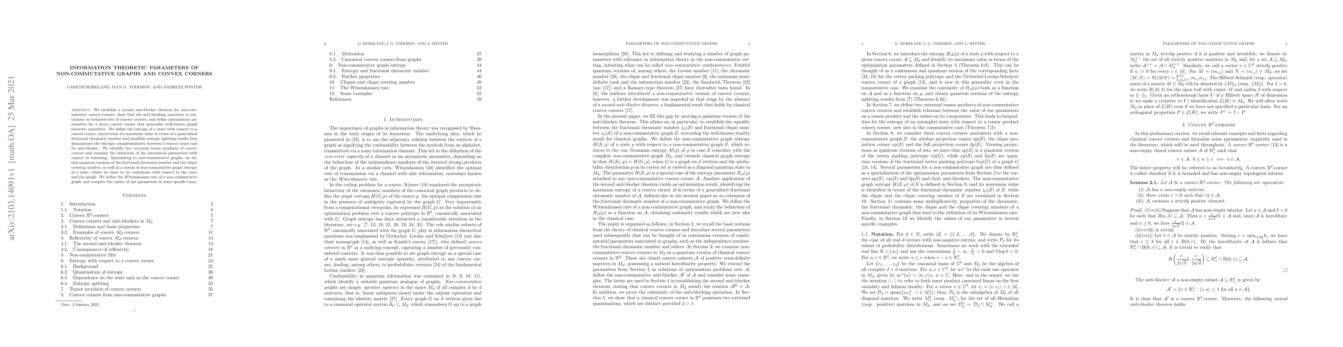 This research paper establishes new parameters for non-commutative convex corners, including entropy, fractional chromatic number, and clique covering number, with implications for quantum graph theory and information theory.