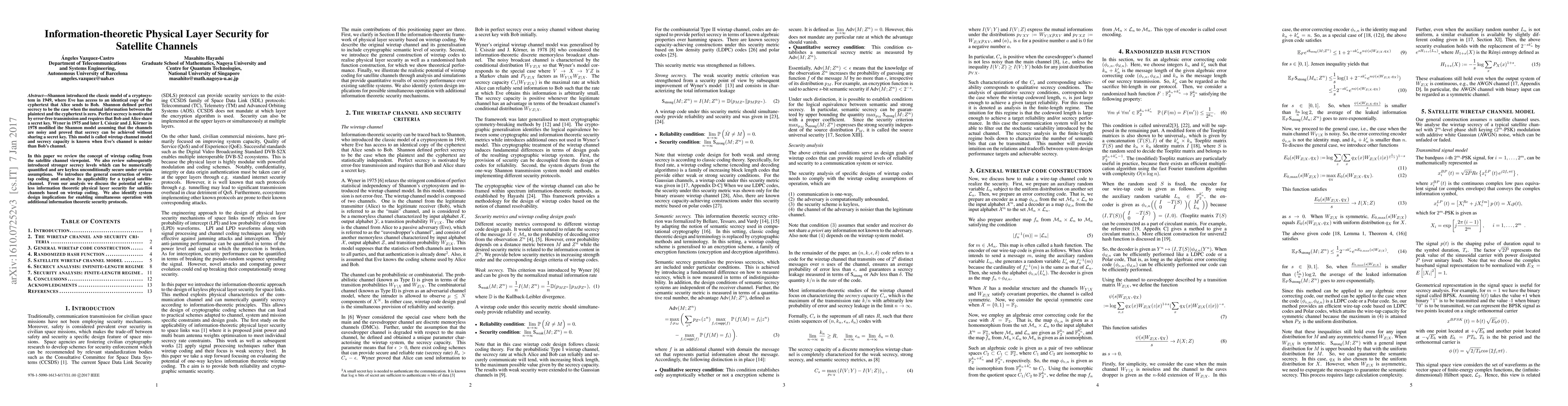 Shannon introduced the classic model of a cryptosystem in 1949, where Eve has access to an identical copy of the cyphertext that Alice sends to Bob. Shannon defined perfect secrecy to be the case when the mutual information between the plaintext and the cyphertext is zero. Perfect secrecy is motivated by error-free transmission and requires that Bob and Alice share a secret key. Wyner in 1975 and later I.~Csisz\'ar and J.~K\"orner in 1978 modified the Shannon model assuming that the channels are noisy and proved that secrecy can be achieved without sharing a secret key. This model is called wiretap channel model and secrecy capacity is known when Eve's channel is noisier than Bob's channel. In this paper we review the concept of wiretap coding from the satellite channel viewpoint. We also review subsequently introduced stronger secrecy levels which can be numerically quantified and are keyless unconditionally secure under certain assumptions. We introduce the general construction of wiretap coding and analyse its applicability for a typical satellite channel. From our analysis we discuss the potential of keyless information theoretic physical layer security for satellite channels based on wiretap coding. We also identify system design implications for enabling simultaneous operation with additional information theoretic security protocols.