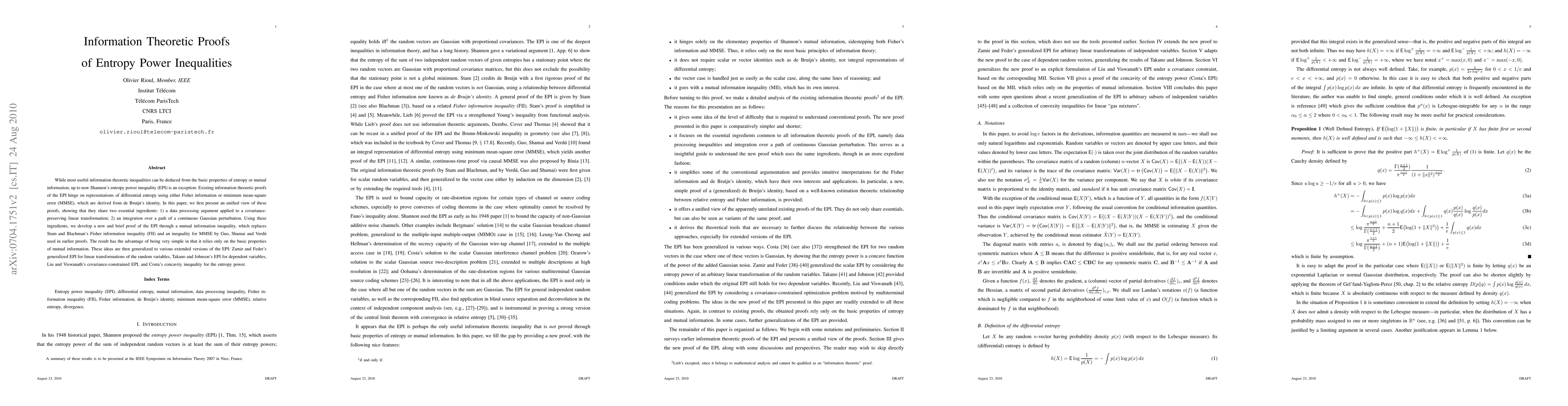 While most useful information theoretic inequalities can be deduced from the basic properties of entropy or mutual information, up to now Shannon's entropy power inequality (EPI) is an exception: Existing information theoretic proofs of the EPI hinge on representations of differential entropy using either Fisher information or minimum mean-square error (MMSE), which are derived from de Bruijn's identity. In this paper, we first present an unified view of these proofs, showing that they share two essential ingredients: 1) a data processing argument applied to a covariance-preserving linear transformation; 2) an integration over a path of a continuous Gaussian perturbation. Using these ingredients, we develop a new and brief proof of the EPI through a mutual information inequality, which replaces Stam and Blachman's Fisher information inequality (FII) and an inequality for MMSE by Guo, Shamai and Verd\'u used in earlier proofs. The result has the advantage of being very simple in that it relies only on the basic properties of mutual information. These ideas are then generalized to various extended versions of the EPI: Zamir and Feder's generalized EPI for linear transformations of the random variables, Takano and Johnson's EPI for dependent variables, Liu and Viswanath's covariance-constrained EPI, and Costa's concavity inequality for the entropy power.