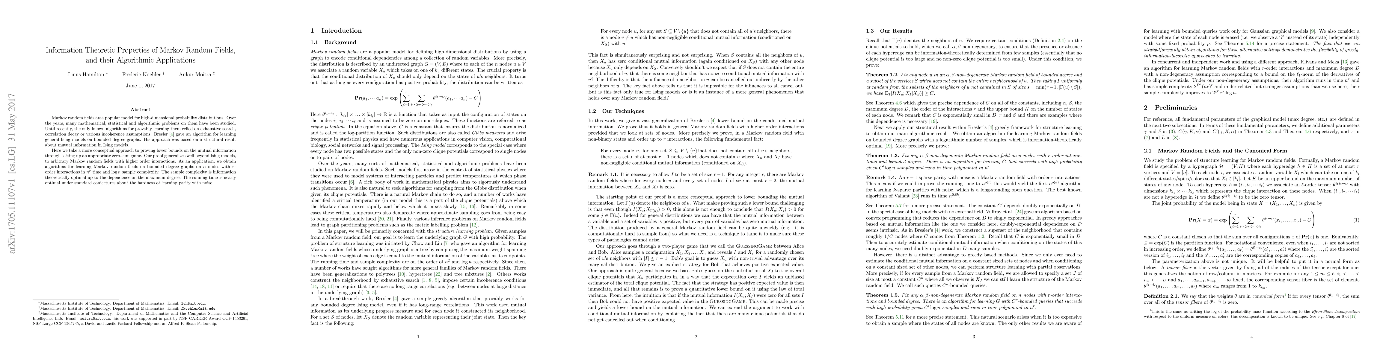 This paper develops a novel information-theoretic approach to establish lower bounds for mutual information in Markov Random Fields, extending beyond Ising models to higher-order interactions. It introduces efficient algorithms for learning such fields on bounded degree graphs with optimal sample complexity and nearly optimal running time.