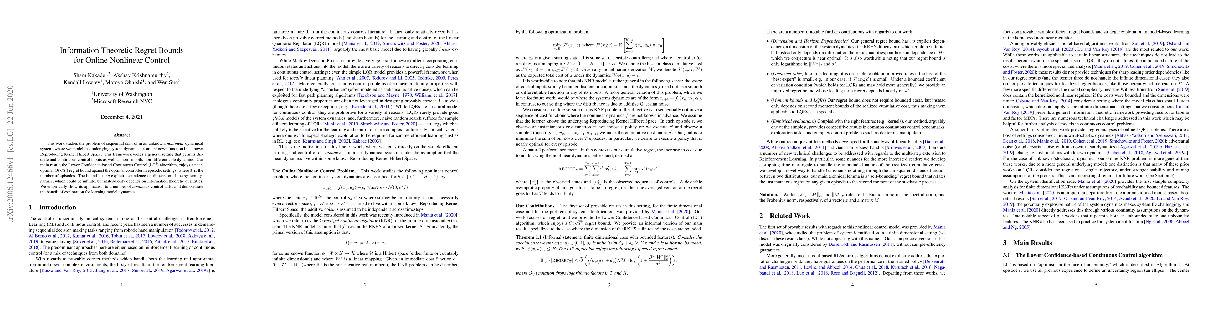 The paper presents an Information Theoretic Regret Bounds for Online Nonlinear Control, utilizing a Lower Confidence-based Continuous Control (LC^3) algorithm within a framework modeling system dynamics as an unknown function in a known Reproducing Kernel Hilbert Space (RKHS). This approach accommodates both discrete and continuous control inputs, as well as non-smooth, non-differentiable dynamics.