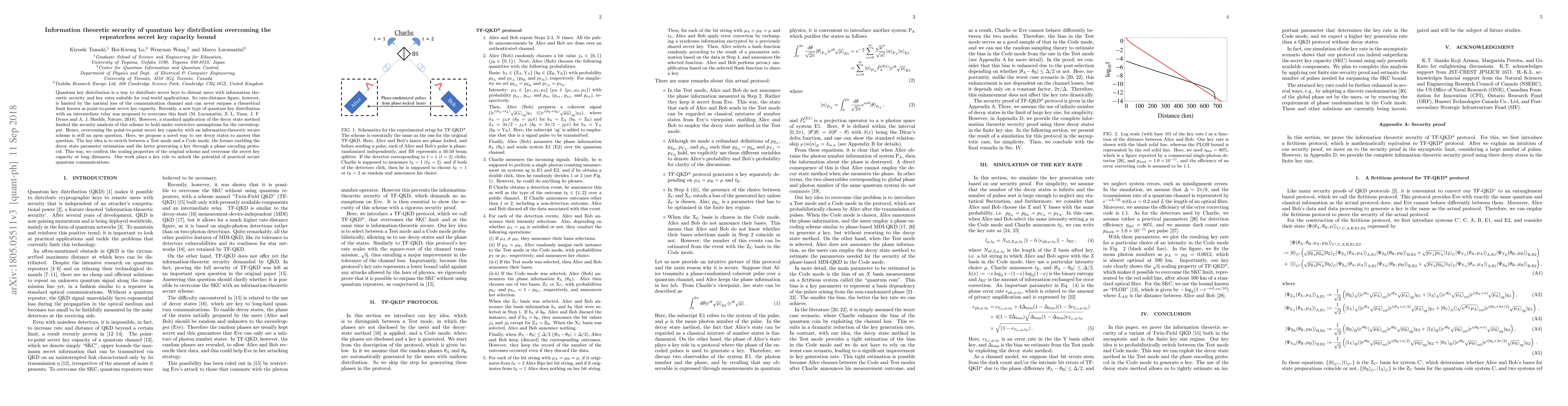 This paper proposes a new quantum key distribution method that overcomes the traditional secret key capacity limit by switching between Test and Code modes, thereby achieving information-theoretic security over long distances without relying on restrictive assumptions about the eavesdropper. This advancement is crucial for practical secure quantum communication.