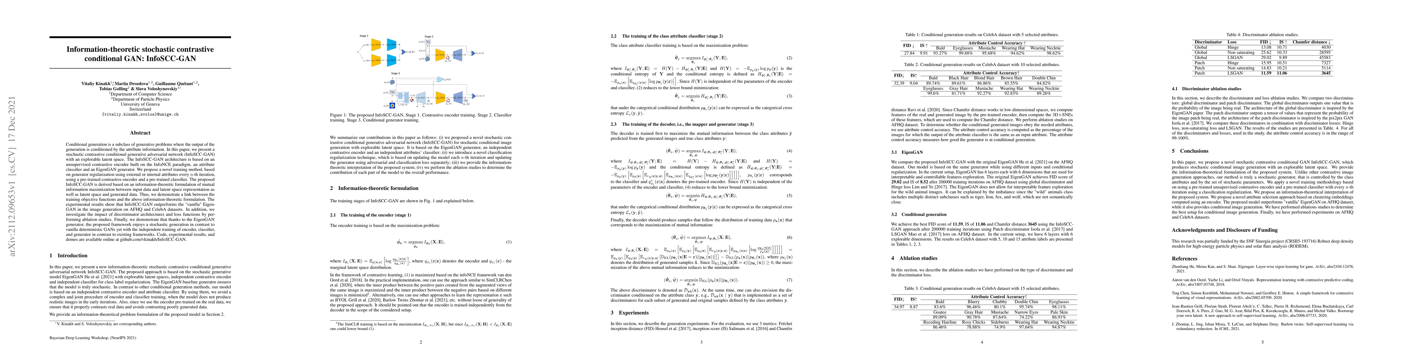 This paper introduces InfoSCC-GAN, a stochastic contrastive conditional GAN that leverages an unsupervised contrastive encoder and an EigenGAN generator for conditional generation. It demonstrates superior performance over vanilla EigenGAN in image generation tasks, showcasing the benefits of its information-theoretic training approach and independent training components.