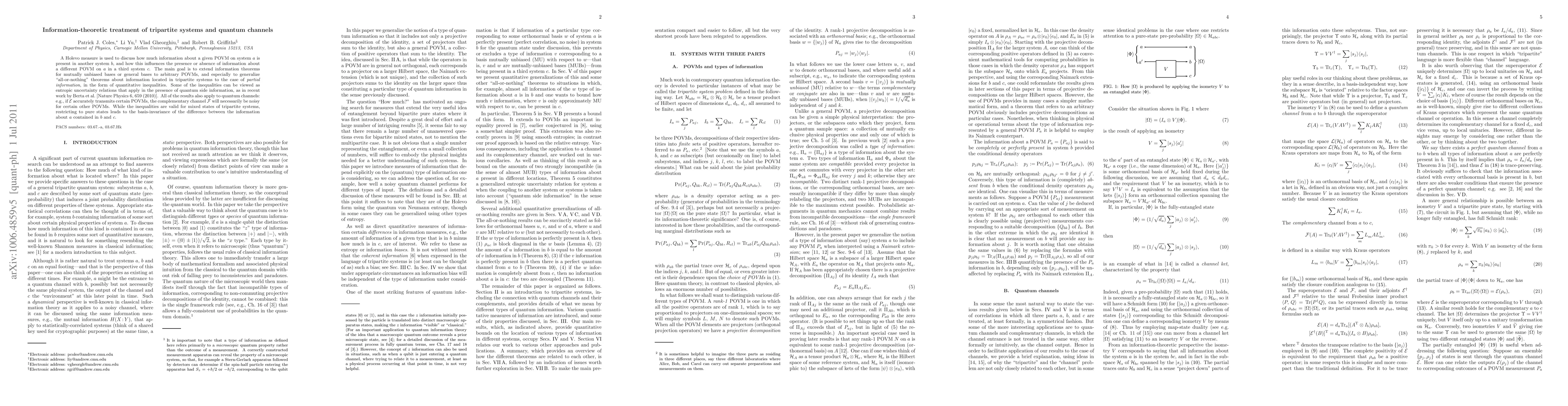A Holevo measure is used to discuss how much information about a given POVM on system $a$ is present in another system $b$, and how this influences the presence or absence of information about a different POVM on $a$ in a third system $c$. The main goal is to extend information theorems for mutually unbiased bases or general bases to arbitrary POVMs, and especially to generalize "all-or-nothing" theorems about information located in tripartite systems to the case of \emph{partial information}, in the form of quantitative inequalities. Some of the inequalities can be viewed as entropic uncertainty relations that apply in the presence of quantum side information, as in recent work by Berta et al. [Nature Physics 6, 659 (2010)]. All of the results also apply to quantum channels: e.g., if $\EC$ accurately transmits certain POVMs, the complementary channel $\FC$ will necessarily be noisy for certain other POVMs. While the inequalities are valid for mixed states of tripartite systems, restricting to pure states leads to the basis-invariance of the difference between the information about $a$ contained in $b$ and $c$.