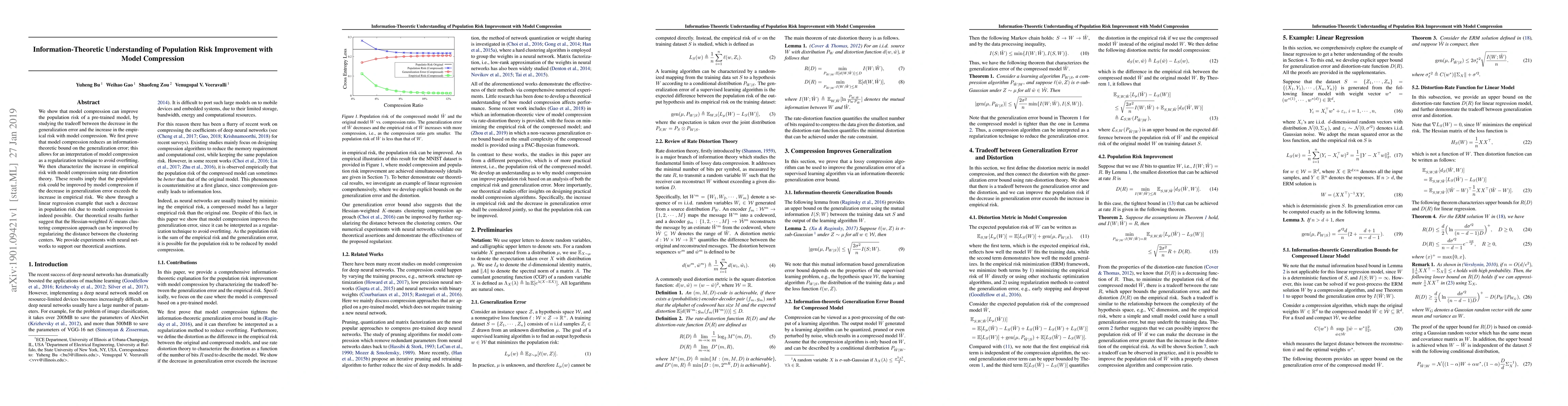This paper demonstrates that model compression can enhance population risk by balancing the reduction in generalization error and the increase in empirical risk. It uses information-theoretic bounds and rate distortion theory to show that compression can act as a regularization method, potentially improving population risk if the reduction in generalization error outweighs the rise in empirical risk.