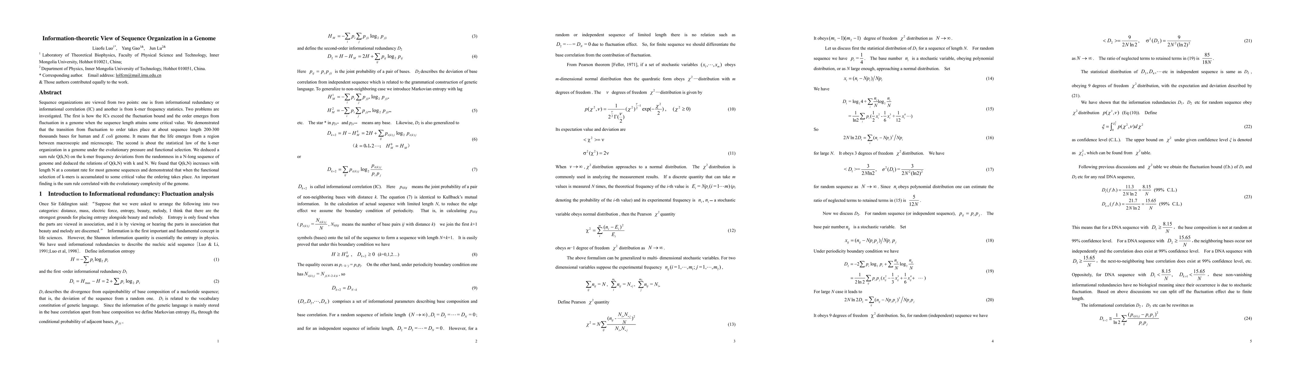Sequence organizations are viewed from two points: one is from informational redundancy or informational correlation (IC) and another is from k-mer frequency statistics. Two problems are investigated. The first is how the ICs exceed the fluctuation bound and the order emerges from fluctuation in a genome when the sequence length attains some critical value. We demonstrated that the transition from fluctuation to order takes place at about sequence length 200-300 thousands bases for human and E coli genome. It means that the life emerges from a region between macroscopic and microscopic. The second is about the statistical law of the k-mer organization in a genome under the evolutionary pressure and functional selection. We deduced a sum rule Q(k,N) on the k-mer frequency deviations from the randomness in a N-long sequence of genome and deduced the relations of Q(k,N) with k and N. We found that Q(k,N) increases with length N at a constant rate for most genome sequences and demonstrated that when the functional selection of k-mers is accumulated to some critical value the ordering takes place. An important finding is the sum rule correlated with the evolutionary complexity of the genome.