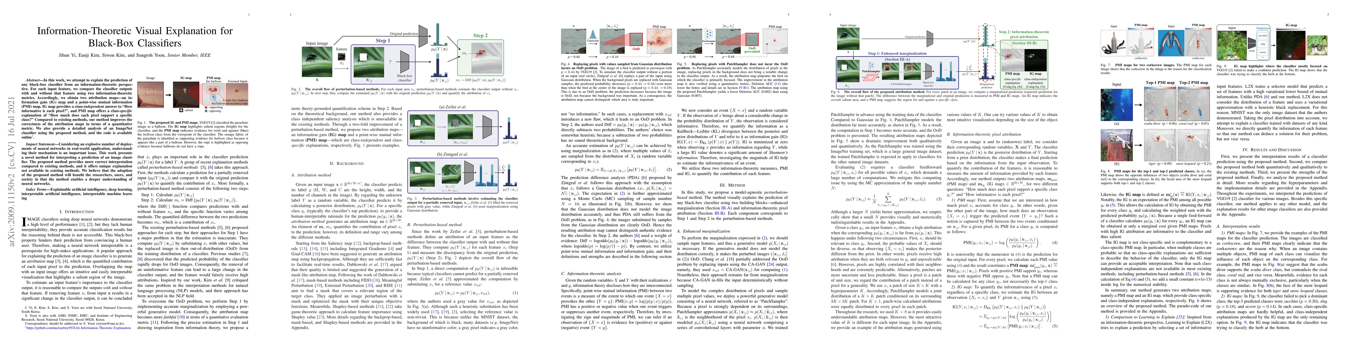 The paper proposes a novel visual explanation method for black-box classifiers based on information theory, using two attribution maps: Point-wise Mutual Information (PMI) and Information Gain (IG). It analyzes an ImageNet classifier and compares the method with existing techniques.