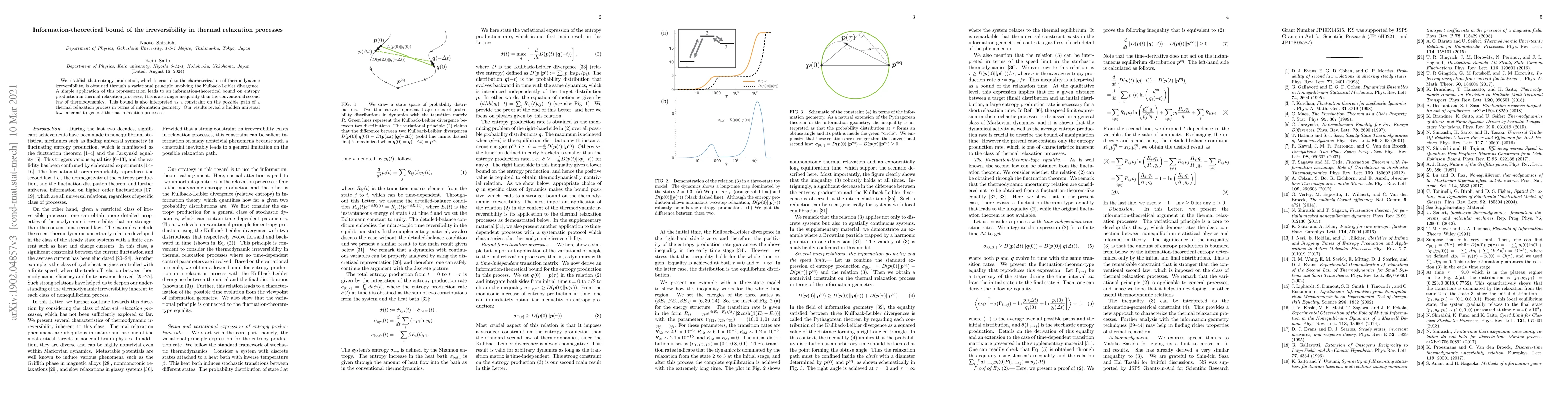 We establish that entropy production, which is crucial to the characterization of thermodynamic irreversibility, is obtained through a variational principle involving the Kulback-Leibler divergence. A simple application of this representation leads to an information-theoretical bound on entropy production in thermal relaxation processes; this is a stronger inequality than the conventional second law of thermodynamics. This bound is also interpreted as a constraint on the possible path of a thermal relaxation process in terms of information geometry. Our results reveal a hidden universal law inherent to general thermal relaxation processes.