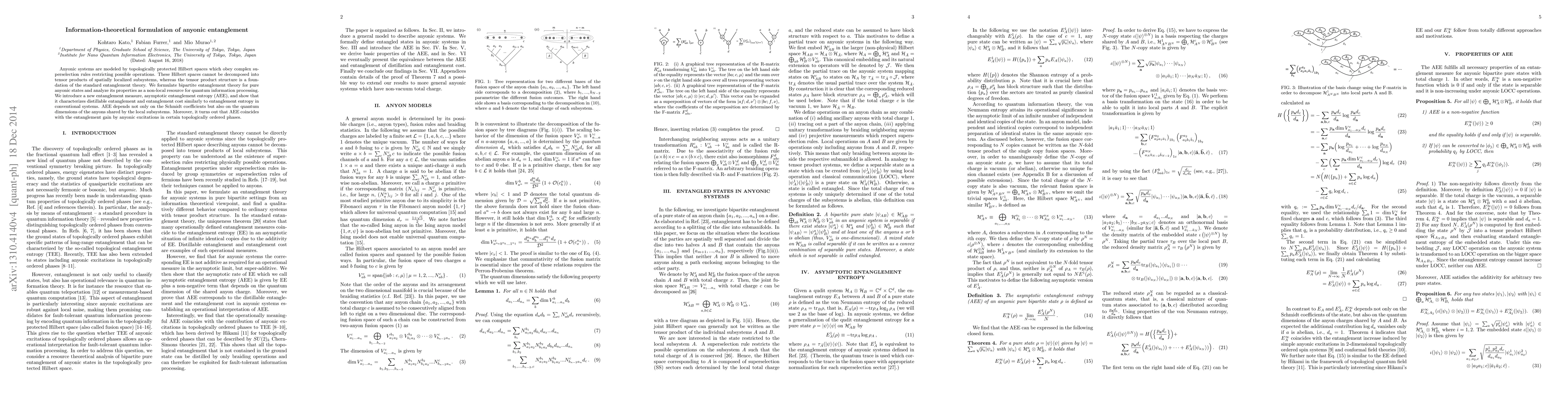 This paper formulates a new bipartite entanglement theory for pure anyonic states, introducing the asymptotic entanglement entropy (AEE) as a measure that considers both Schmidt coefficients and quantum dimensions of anyons. AEE parallels entanglement entropy in conventional systems, characterizing distilable entanglement and quantifying entanglement cost.