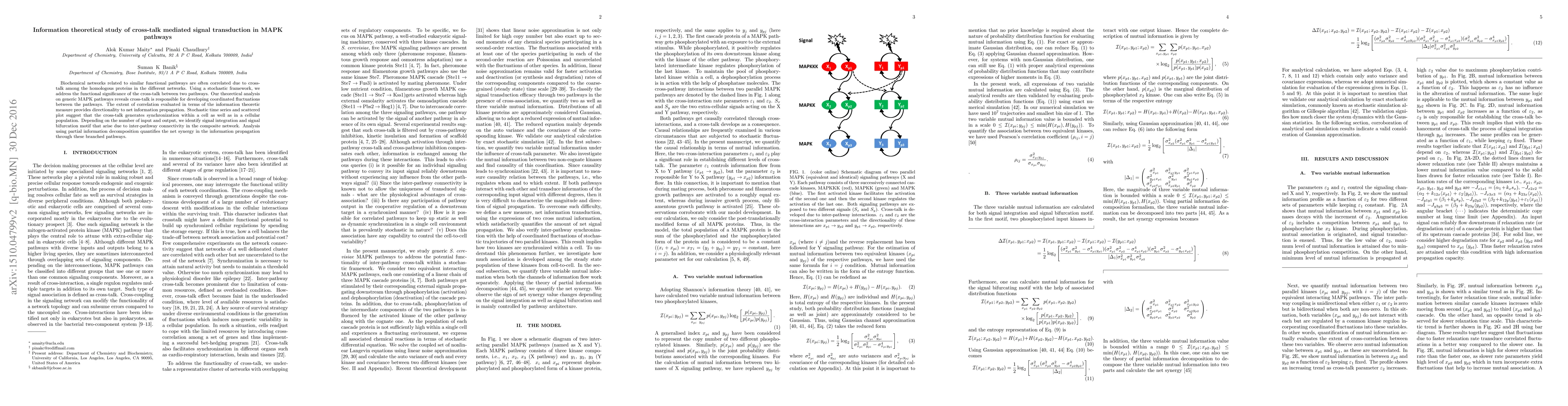 Biochemical networks related to similar functional pathways are often correlated due to cross-talk among the homologous proteins in the different networks. Using a stochastic framework, we address the functional significance of the cross-talk between two pathways. Our theoretical analysis on generic MAPK pathways reveals cross-talk is responsible for developing coordinated fluctuations between the pathways. The extent of correlation evaluated in terms of the information theoretic measure provides directionality to net information propagation. Stochastic time series and scattered plot suggest that the cross-talk generates synchronization within a cell as well as in a cellular population. Depending on the number of input and output, we identify signal integration and signal bifurcation motif that arise due to inter-pathway connectivity in the composite network. Analysis using partial information decomposition quantifies the net synergy in the information propagation through these branched pathways.