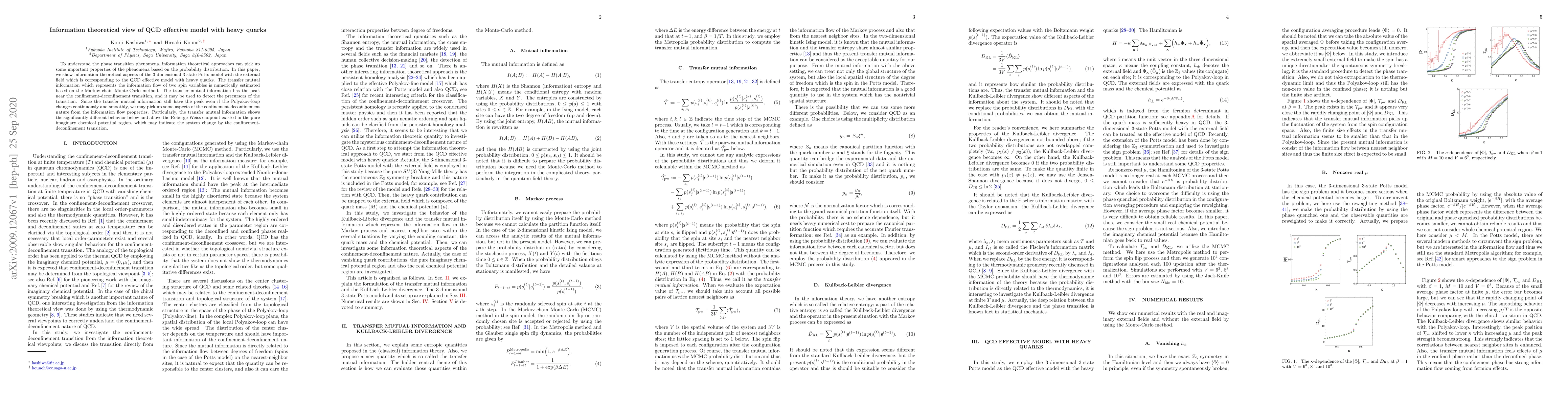 To understand the phase transition phenomena, information theoretical approaches can pick up some important properties of the phenomena based on the probability distribution. In this paper, we show information theoretical aspects of the 3-dimensional 3-state Potts model with the external field which is corresponding to the QCD effective model with heavy quarks. The transfer mutual information which represents the information flow of two spin variables is numerically estimated based on the Markov-chain Monte-Carlo method. The transfer mutual information has the peak near the confinement-deconfinement transition, and it may be used to detect the precursors of the transition. Since the transfer mutual information still have the peak even if the Polyakov-loop changes continuously and smoothly, we may pick up some aspects of the confinement-deconfinement nature from the information flow properties. Particularly, the transfer mutual information shows the significantly different behavior below and above the Roberge-Weiss endpoint existed in the pure imaginary chemical potential region, which may indicate the system change by the confinement-deconfinement transition.