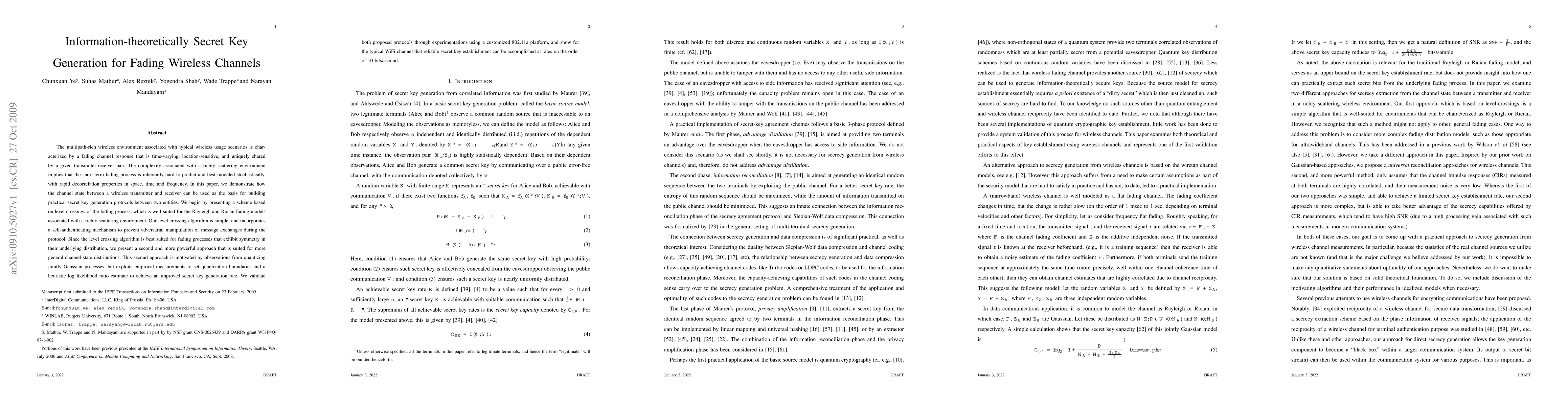 This paper presents practical secret key generation protocols for fading wireless channels using channel state information. The authors propose two algorithms: one based on level crossings for symmetric fading models, and a second, more general approach leveraging empirical measurements and heuristic log likelihood ratios. Experimental results on a customized 802.11a platform demonstrate reliable secret key establishment at rates around 10 bits/second.