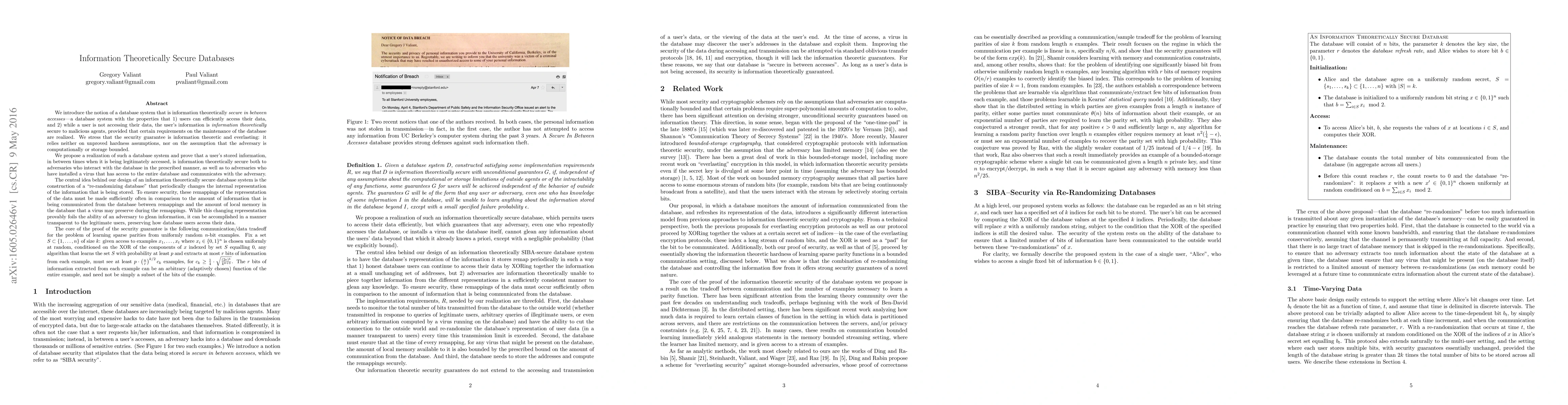 This paper introduces a database system that ensures information-theoretic security between user accesses, without relying on unproven assumptions or bounded adversaries. The system achieves this through a "re-randomizing database" that frequently changes data representations, ensuring security through a communication/data tradeoff for learning sparse parities.