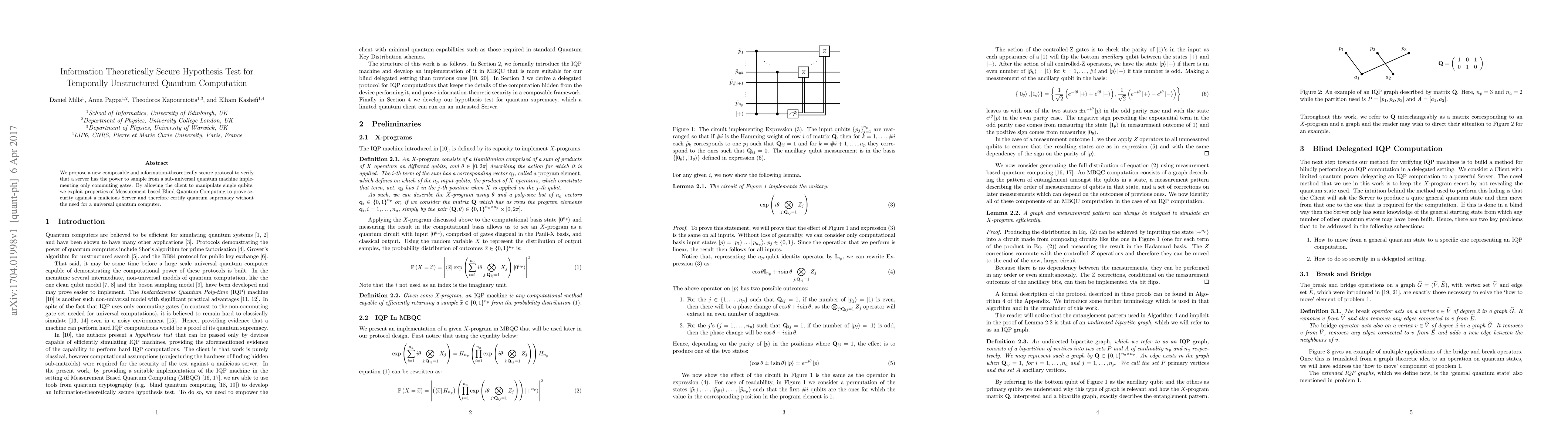 We propose a new composable and information-theoretically secure protocol to verify that a server has the power to sample from a sub-universal quantum machine implementing only commuting gates. By allowing the client to manipulate single qubits, we exploit properties of Measurement based Blind Quantum Computing to prove security against a malicious Server and therefore certify quantum supremacy without the need for a universal quantum computer.