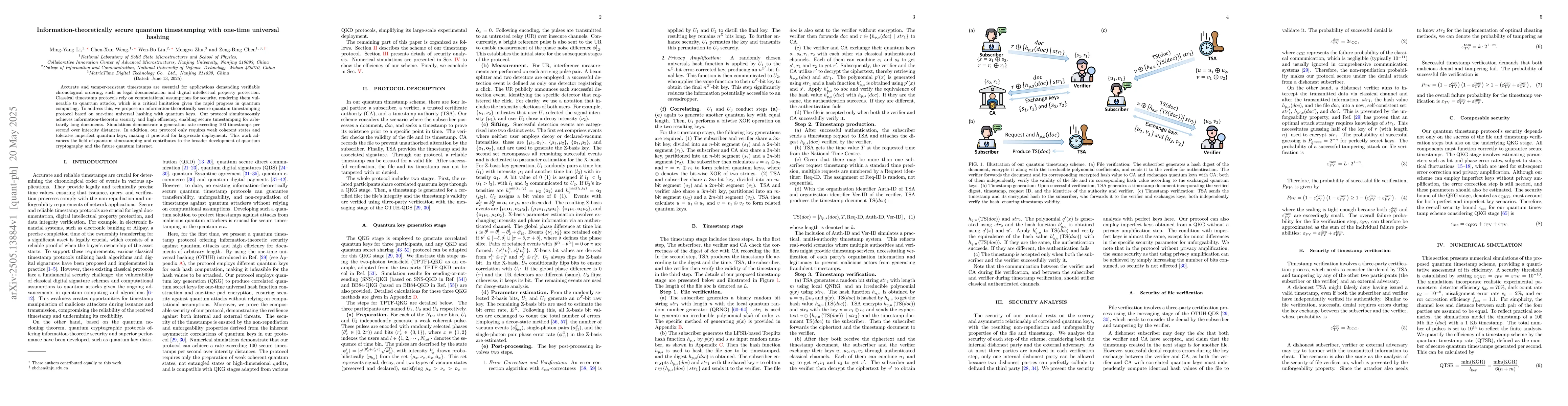 The paper proposes a quantum timestamping protocol using one-time universal hashing with quantum keys, ensuring information-theoretic security.