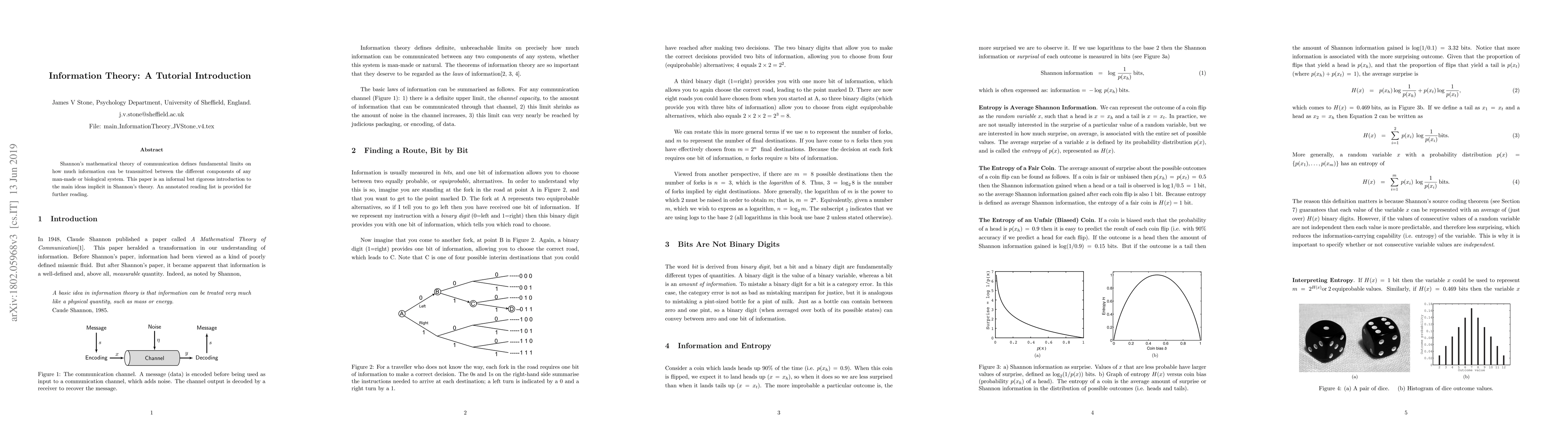 This tutorial introduces Shannon's information theory, outlining its core principles that set the limits on information transmission in various systems. It includes an annotated reading list for deeper exploration of the subject.