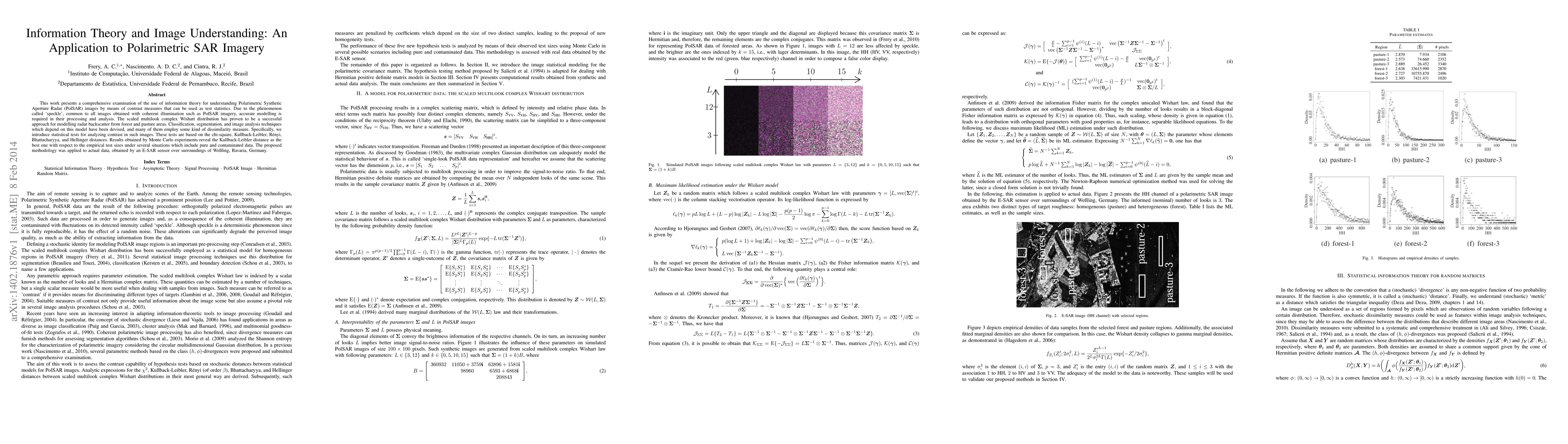 This paper explores the application of information theory to analyze Polarimetric Synthetic Aperture Radar (PolSAR) images using contrast measures like chi-square, Kullback-Leibler, Rényi, Bhattacharyya, and Hellinger distances. The Kullback-Leibler distance emerged as the most effective for analyzing speckled PolSAR imagery, validated through Monte Carlo experiments and applied to real E-SAR data from Weßling, Bavaria.