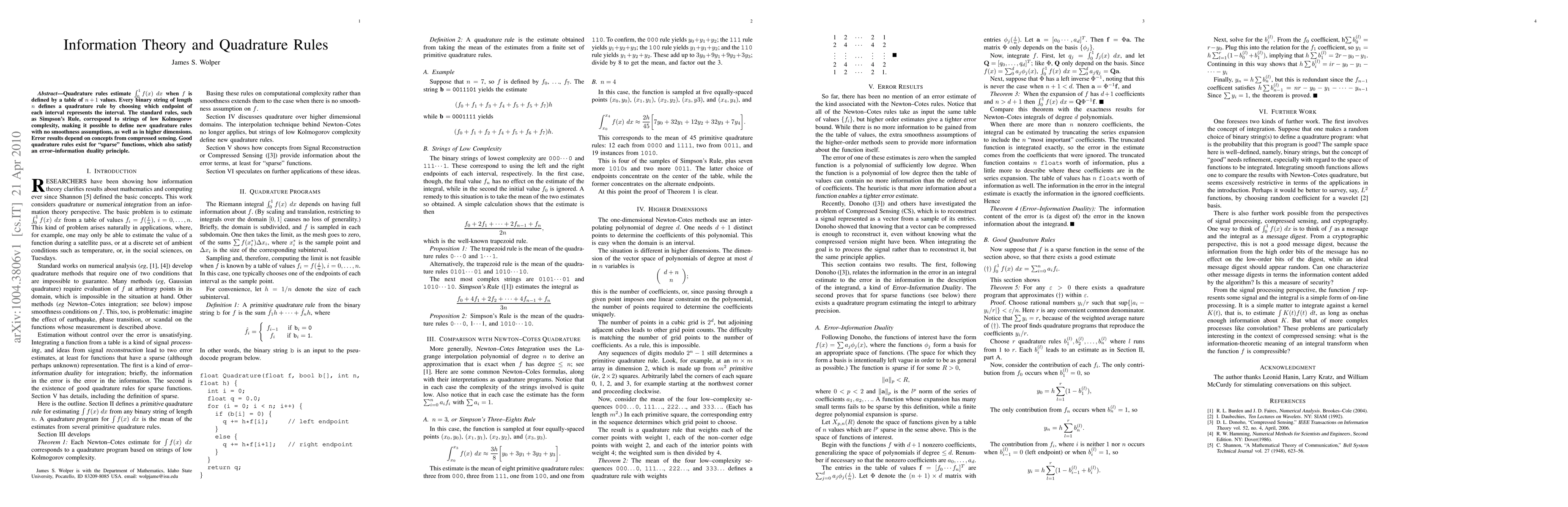 Quadrature rules estimate the value of an integral when the function is given by a table of values. Every binary string defines a quadrature rule by choosing which endpoint of each interval represents the interval. The standard rules, such as Simpson's Rule, correspond to strings of low Kolmogorov complexity, making it possible to define new quadrature rules with no smoothness assumptions, as well as in higher dimensions. Error results depend on concepts from compressed sensing. Good quadrature rules exist for "sparse" functions, which also satisfy an error--information duality principle.