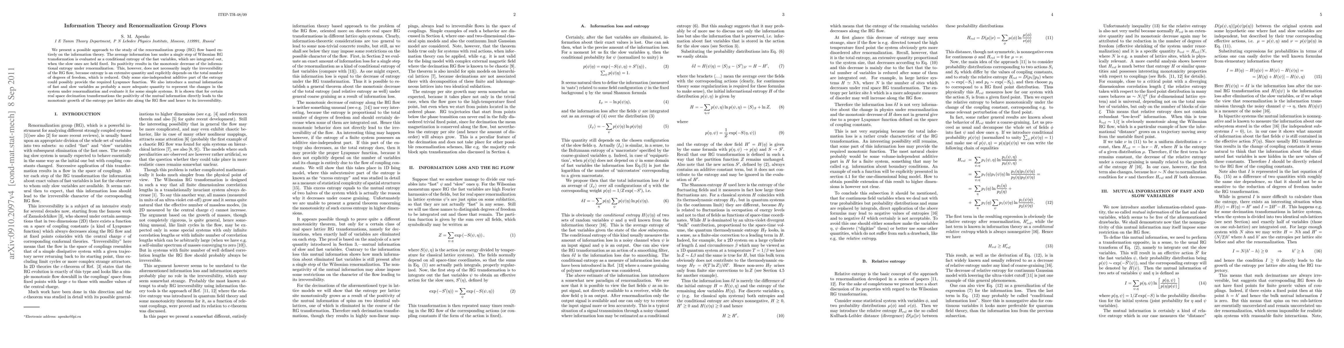 We present a possible approach to the study of the renormalization group (RG) flow based entirely on the information theory. The average information loss under a single step of Wilsonian RG transformation is evaluated as a conditional entropy of the fast variables, which are integrated out, when the slow ones are held fixed. Its positivity results in the monotonic decrease of the informational entropy under renormalization. This, however, does not necessarily imply the irreversibility of the RG flow, because the entropy explicitly depends on the total number of degrees of freedom, which is reduced. Only some size-independent additive part of the entropy could possibly provide the required Lyapunov function. We also introduce a mutual information of fast and slow variables as probably a more adequate quantity to represent the changes in the system under renormalization and evaluate it for some simple systems. It is shown that for certain real space decimation transformations the positivity of the mutual information directly leads to the monotonic growth of the entropy per lattice site along the RG flow and hence to its irreversibility.