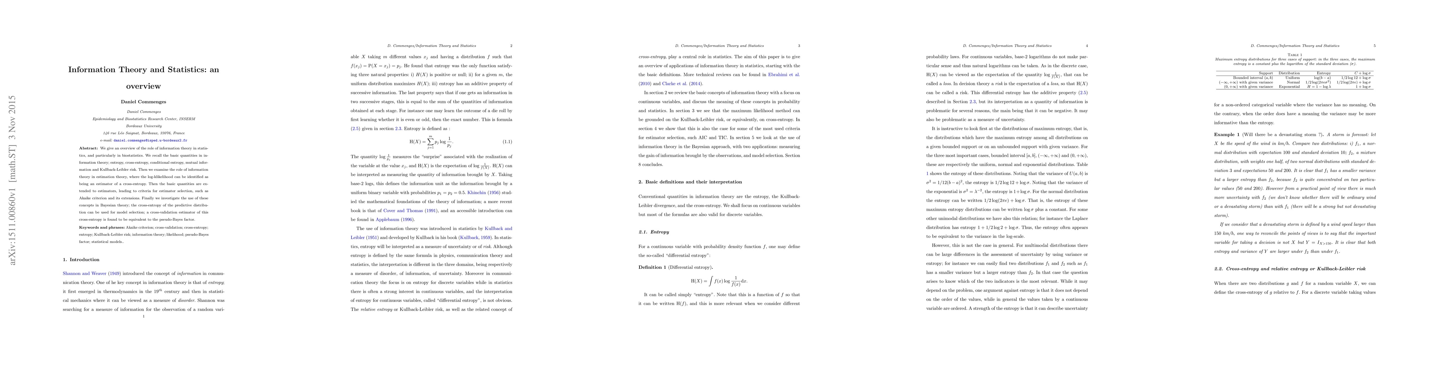 We give an overview of the role of information theory in statistics, and particularly in biostatistics. We recall the basic quantities in information theory; entropy, cross-entropy, conditional entropy, mutual information and Kullback-Leibler risk. Then we examine the role of information theory in estimation theory, where the log-klikelihood can be identified as being an estimator of a cross-entropy. Then the basic quantities are extended to estimators, leading to criteria for estimator selection, such as Akaike criterion and its extensions. Finally we investigate the use of these concepts in Bayesian theory; the cross-entropy of the predictive distribution can be used for model selection; a cross-validation estimator of this cross-entropy is found to be equivalent to the pseudo-Bayes factor.