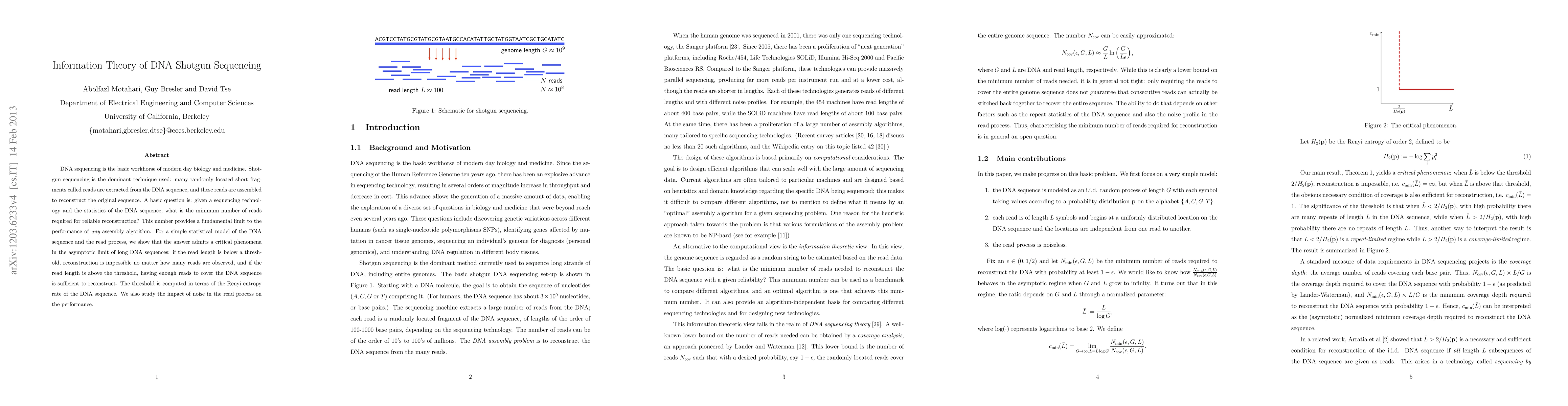 This paper investigates the information theory behind DNA shotgun sequencing, determining the minimum number of reads required for reliable reconstruction. It finds a threshold read length below which reconstruction is impossible, above which sufficient reads can achieve reconstruction, computed using the Renyi entropy rate of the DNA sequence, and examines the effect of noise on read performance.
