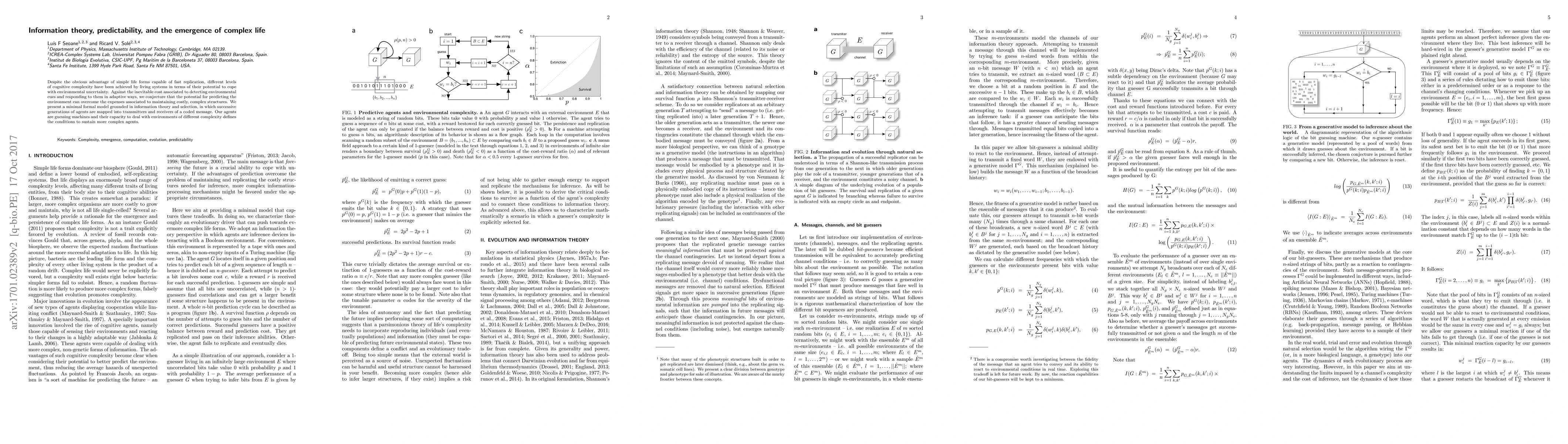 A research paper proposes a minimal model that uses information theory to explain how simple life forms can develop into complex ones despite potential costs associated with environmental uncertainty. The model suggests that the ability to predict the environment can overcome these costs, enabling the evolution of more complex agents.