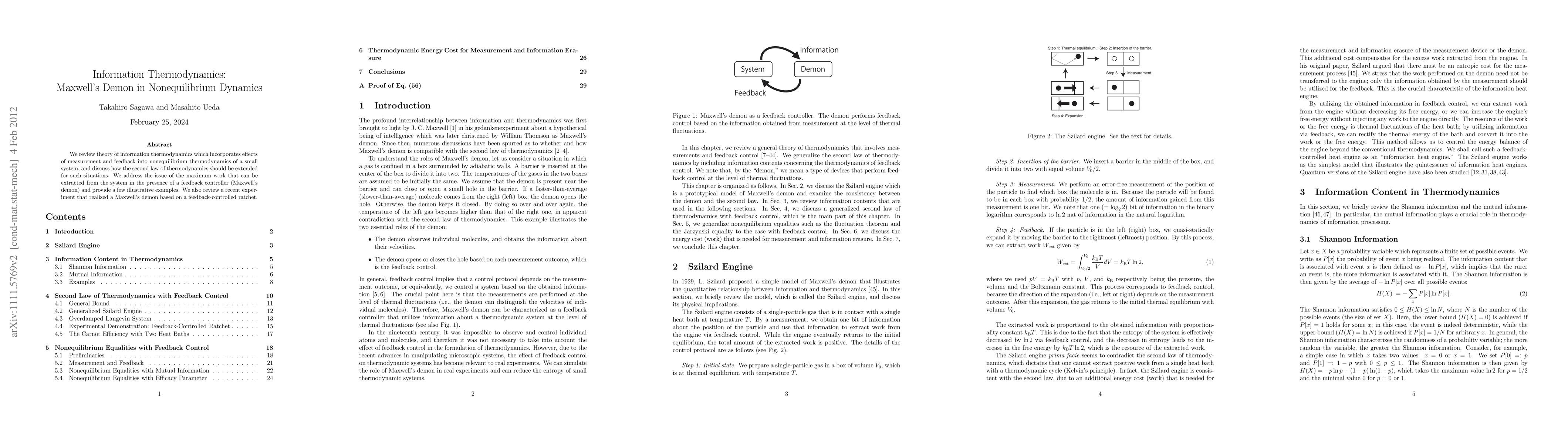 This paper reviews information thermodynamics, focusing on how measurement and feedback influence nonequilibrium systems, and extends the second law to these contexts. It discusses the maximum extractable work from systems with a feedback controller, akin to Maxwell's demon, and highlights recent experimental realizations of such demons.