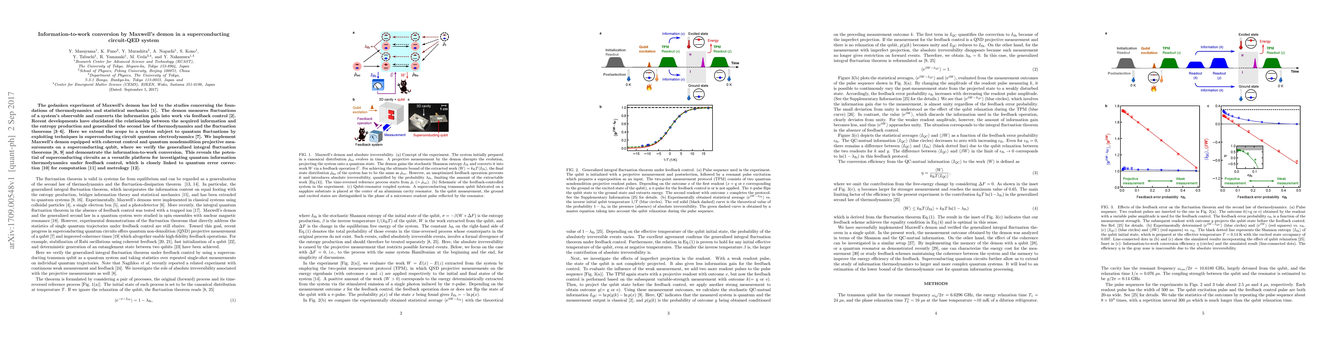 This paper investigates the conversion of information into work using Maxwell's demon in a superconducting circuit quantum electrodynamics system, demonstrating the generalized integral fluctuation theorems and showcasing the potential of superconducting circuits for quantum information thermodynamics studies.