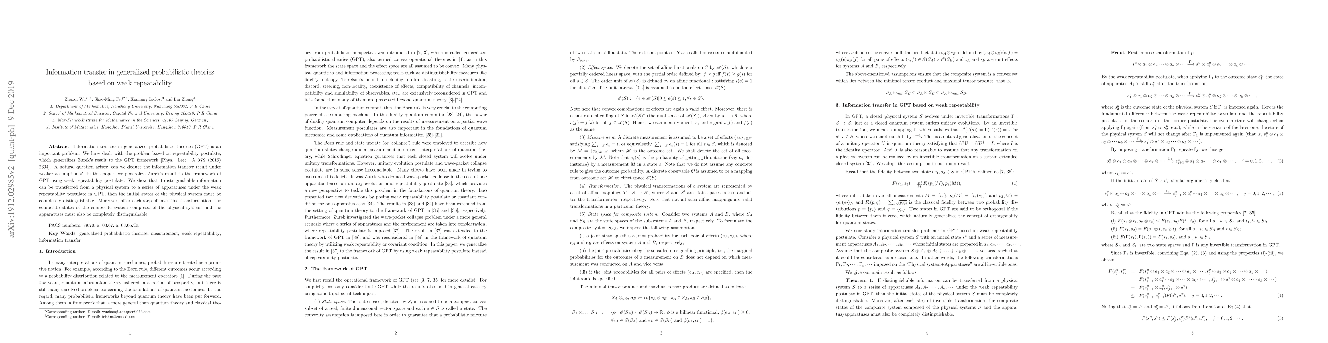 Information transfer in generalized probabilistic theories (GPT) is an important problem. We have dealt with the problem based on repeatability postulate, which generalizes Zurek's result to the GPT framework [Phys. Lett. A \textbf{379} (2015) 2694]. A natural question arises: can we deduce the information transfer result under weaker assumptions? In this paper, we generalize Zurek's result to the framework of GPT using weak repeatability postulate. We show that if distinguishable information can be transferred from a physical system to a series of apparatuses under the weak repeatability postulate in GPT, then the initial states of the physical system must be completely distinguishable. Moreover, after each step of invertible transformation, the composite states of the composite system composed of the physical systems and the apparatuses must also be completely distinguishable.