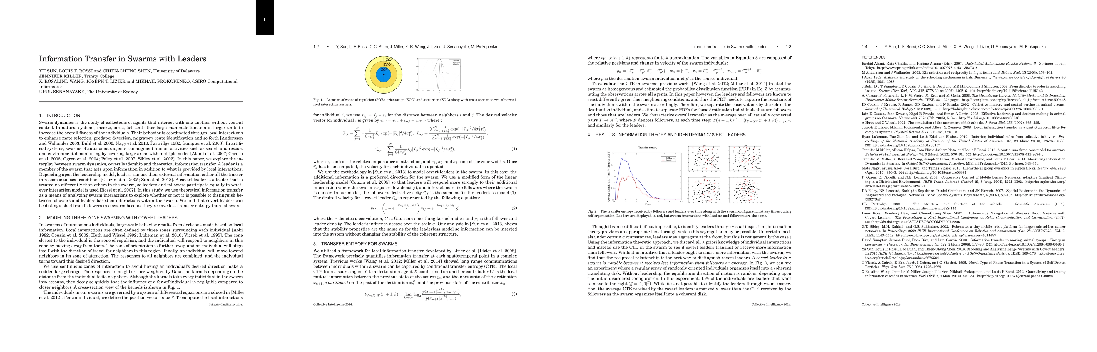 Swarm dynamics is the study of collections of agents that interact with one another without central control. In natural systems, insects, birds, fish and other large mammals function in larger units to increase the overall fitness of the individuals. Their behavior is coordinated through local interactions to enhance mate selection, predator detection, migratory route identification and so forth [Andersson and Wallander 2003; Buhl et al. 2006; Nagy et al. 2010; Partridge 1982; Sumpter et al. 2008]. In artificial systems, swarms of autonomous agents can augment human activities such as search and rescue, and environmental monitoring by covering large areas with multiple nodes [Alami et al. 2007; Caruso et al. 2008; Ogren et al. 2004; Paley et al. 2007; Sibley et al. 2002]. In this paper, we explore the interplay between swarm dynamics, covert leadership and theoretical information transfer. A leader is a member of the swarm that acts upon information in addition to what is provided by local interactions. Depending upon the leadership model, leaders can use their external information either all the time or in response to local conditions [Couzin et al. 2005; Sun et al. 2013]. A covert leader is a leader that is treated no differently than others in the swarm, so leaders and followers participate equally in whatever interaction model is used [Rossi et al. 2007]. In this study, we use theoretical information transfer as a means of analyzing swarm interactions to explore whether or not it is possible to distinguish between followers and leaders based on interactions within the swarm. We find that covert leaders can be distinguished from followers in a swarm because they receive less transfer entropy than followers.