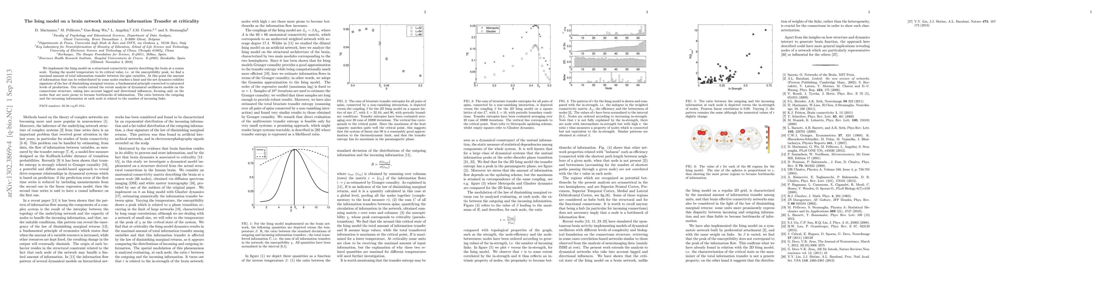 This paper explores the Ising model on a brain network's structural connectivity matrix, finding maximal information transfer at the model's critical temperature. The study reveals that information redistribution by certain nodes reaches a limit, exhibiting a law of diminishing marginal returns, and highlights the role of nodes with more incoming links as potential information bottlenecks.