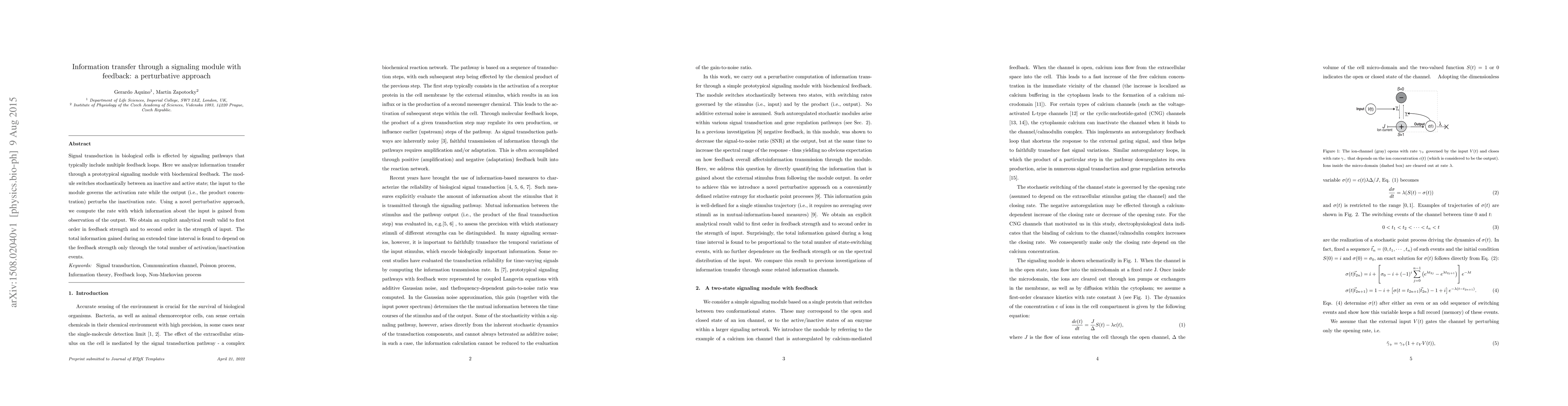 Signal transduction in biological cells is effected by signaling pathways that typically include multiple feedback loops. Here we analyze information transfer through a prototypical signaling module with biochemical feedback. The module switches stochastically between an inactive and active state; the input to the module governs the activation rate while the output (i.e., the product concentration) perturbs the inactivation rate. Using a novel perturbative approach, we compute the rate with which information about the input is gained from observation of the output. We obtain an explicit analytical result valid to first order in feedback strength and to second order in the strength of input. The total information gained during an extended time interval is found to depend on the feedback strength only through the total number of activation/inactivation events.