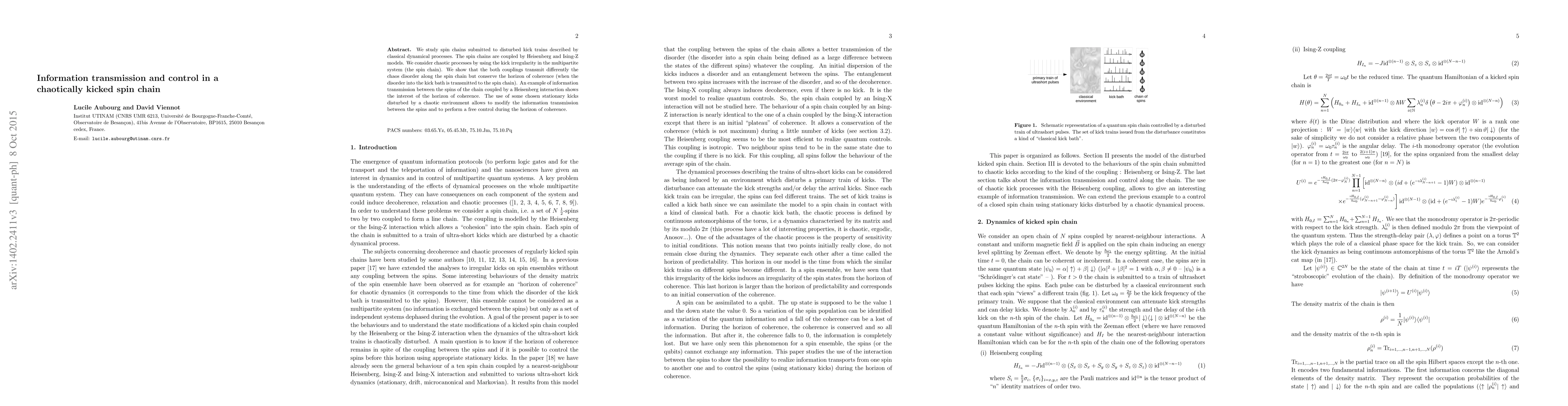 We study spin chains submitted to disturbed kick trains described by classical dynamical processes. The spin chains are coupled by Heisenberg and Ising-Z models. We consider chaotic processes by using the kick irregularity in the multipartite system (the spin chain). We show that the both couplings transmit differently the chaos disorder along the spin chain but conserve the horizon of coherence (when the disorder into the kick bath is transmitted to the spin chain). An example of information transmission between the spins of the chain coupled by a Heisenberg interaction shows the interest of the horizon of coherence. The use of some chosen stationary kicks disturbed by a chaotic environment allows to modify the information transmission between the spins and to perform a free control during the horizon of coherence.