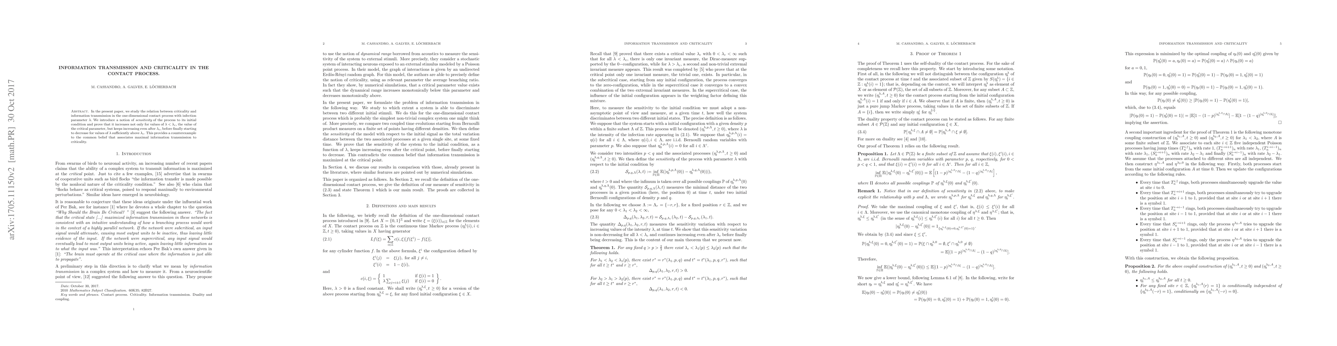 In the present paper, we study the relation between criticality and information transmission in the one-dimensional contact process with infection parameter $\lambda .$ To do this we define the {\it sensitivity} of the process to its initial condition. This sensitivity increases for values of $\lambda < \lambda_c, $ the value of the critical parameter. The main point of the present paper is that we show that actually it continues increasing even after $ \lambda_c $ and only starts decreasing for sufficiently large values of $\lambda .$ This provides a counterexample to the common belief that associates maximal information transmission to criticality.