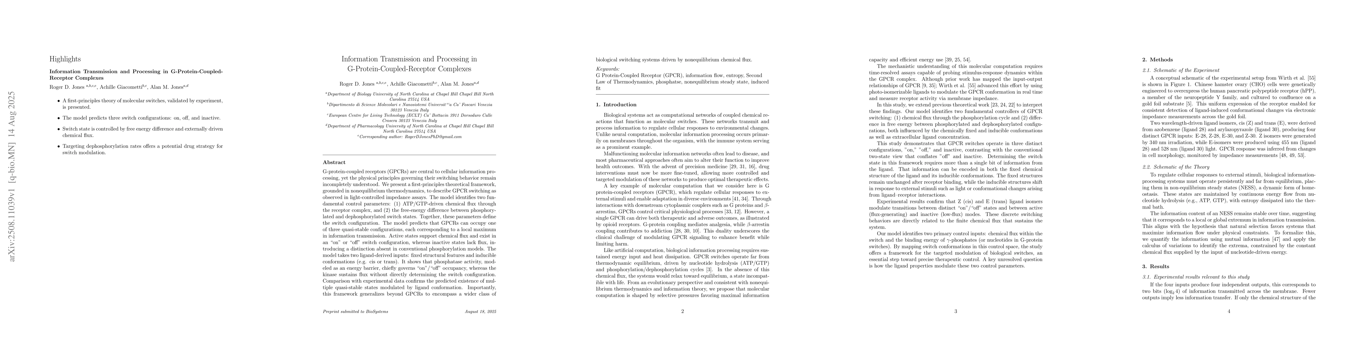 G-protein-coupled receptors (GPCRs) are central to cellular information processing, yet the physical principles governing their switching behavior remain incompletely understood. We present a first principles theoretical framework, grounded in nonequilibrium thermodynamics, to describe GPCR switching as observed in light-controlled impedance assays. The model identifies two fundamental control parameters: (1) ATP/GTP-driven chemical flux through the receptor complex, and (2) the free-energy difference between phosphorylated and dephosphorylated switch states. Together, these parameters defin the switch configuration. The model predicts that GPCRs can occupy one of three quasi-stable configurations, each corresponding to a local maximum in information transmission. Active states support chemical flux and exist in an on or off switch configuration, whereas inactive states lack flux, introducing a distinction absent in conventional phosphorylation models. The model takes two ligand-derived inputs: fixed structural features and inducible conformations (e.g. cis or trans). It shows that phosphatase activity, modeled as an energy barrier, chiefly governs on/off occupancy, whereas the kinase sustains flux without directly determining the switch configuration. Comparison with experimental data confirms the predicted existence of multiple quasi-stable states modulated by ligand conformation. Importantly, this framework generalizes beyond GPCRs to encompass a wider class of biological switching systems driven by nonequilibrium chemical flux.