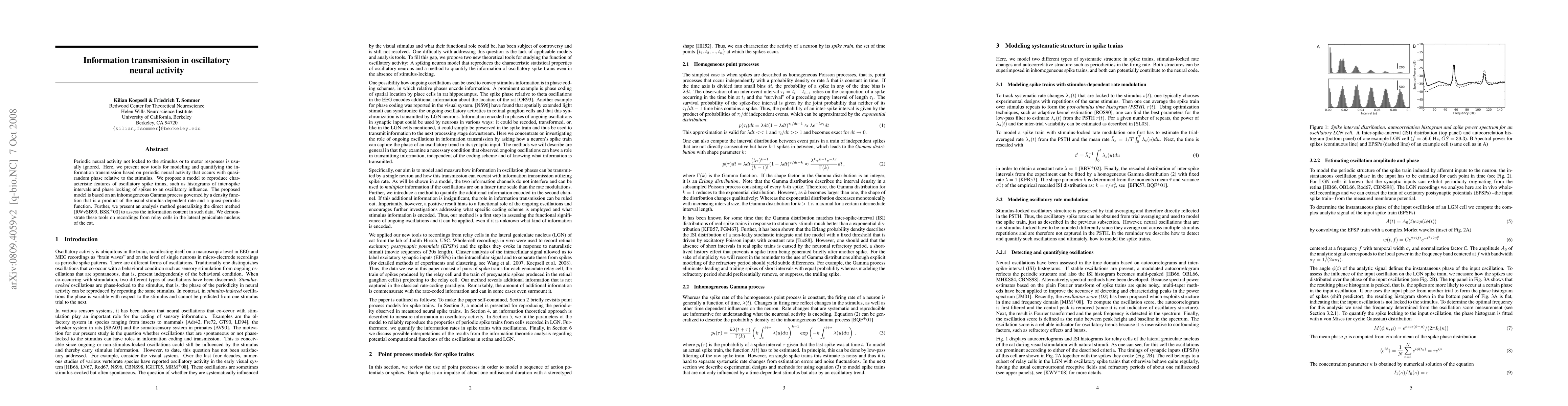 Periodic neural activity not locked to the stimulus or to motor responses is usually ignored. Here, we present new tools for modeling and quantifying the information transmission based on periodic neural activity that occurs with quasi-random phase relative to the stimulus. We propose a model to reproduce characteristic features of oscillatory spike trains, such as histograms of inter-spike intervals and phase locking of spikes to an oscillatory influence. The proposed model is based on an inhomogeneous Gamma process governed by a density function that is a product of the usual stimulus-dependent rate and a quasi-periodic function. Further, we present an analysis method generalizing the direct method (Rieke et al, 1999; Brenner et al, 2000) to assess the information content in such data. We demonstrate these tools on recordings from relay cells in the lateral geniculate nucleus of the cat.