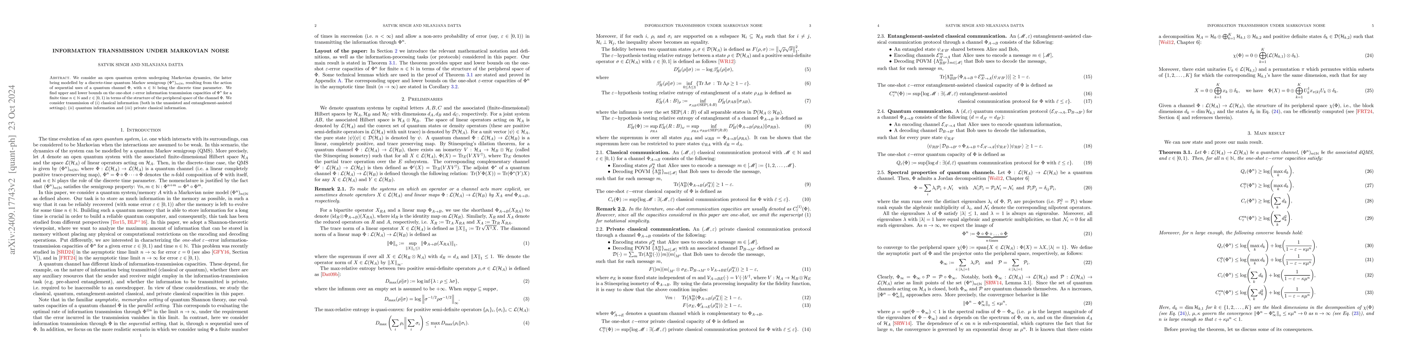 We consider an open quantum system undergoing Markovian dynamics, the latter being modelled by a discrete-time quantum Markov semigroup $(\Phi^n)_{n \in {\mathbb{N}}}$, resulting from the action of sequential uses of a quantum channel $\Phi$, with $n \in {\mathbb{N}}$ being the discrete time parameter. We find upper and lower bounds on the one-shot $\epsilon$-error information transmission capacities of $\Phi^n$ for a finite time $n\in \mathbb{N}$ and $\epsilon \in [0,1)$ in terms of the structure of the peripheral space of the channel $\Phi$. We consider transmission of $(i)$ classical information (both in the unassisted and entanglement-assisted settings); $(ii)$ quantum information and $(iii)$ private classical information.