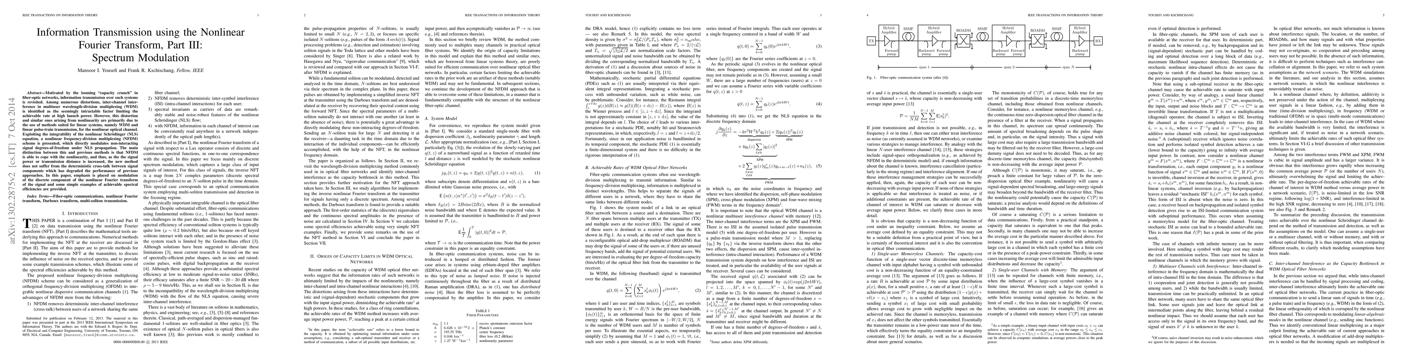 This paper proposes a nonlinear frequency-division multiplexing (NFDM) scheme to enhance information transmission in fiber-optic networks by directly addressing the nonlinearity of the optical channel, thereby avoiding inter-channel interference and improving spectral efficiency. Unlike traditional WDM, NFDM modulates the discrete component of the nonlinear Fourier transform, offering better performance at higher signal powers and distances.